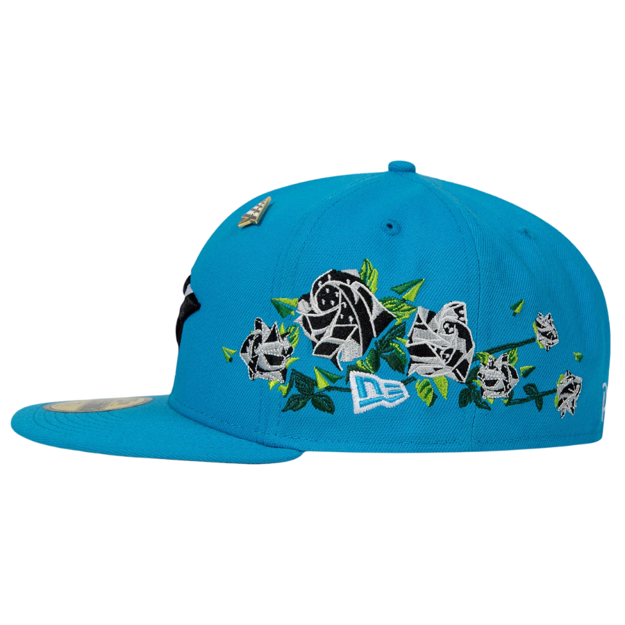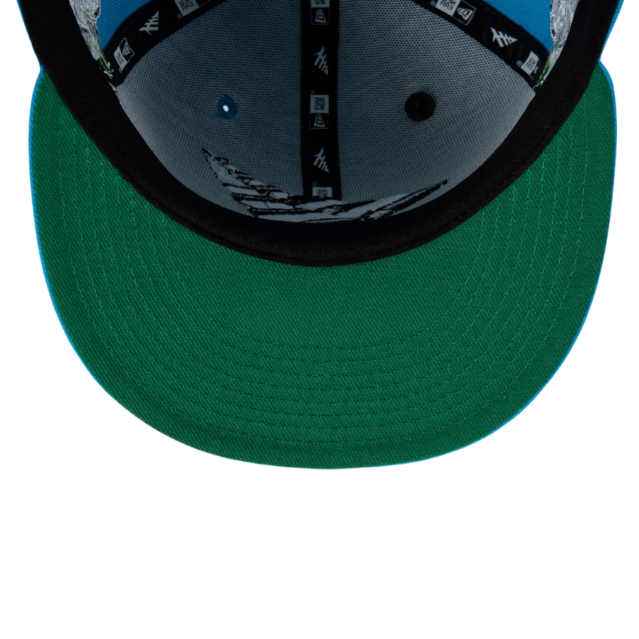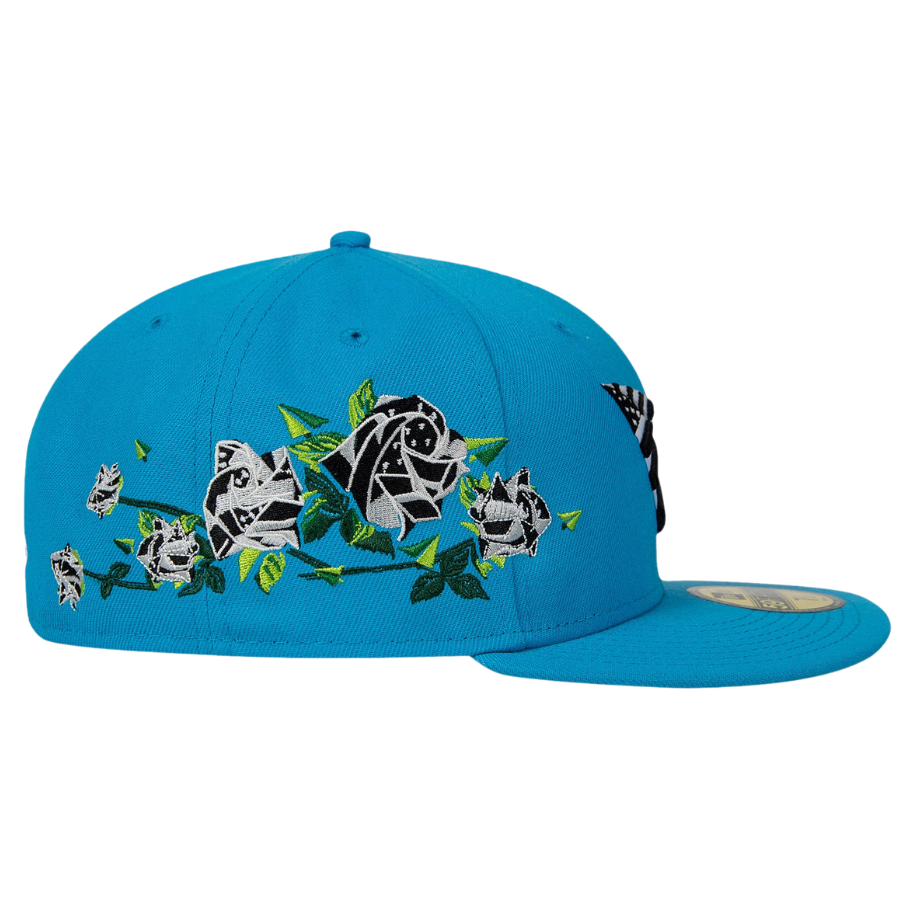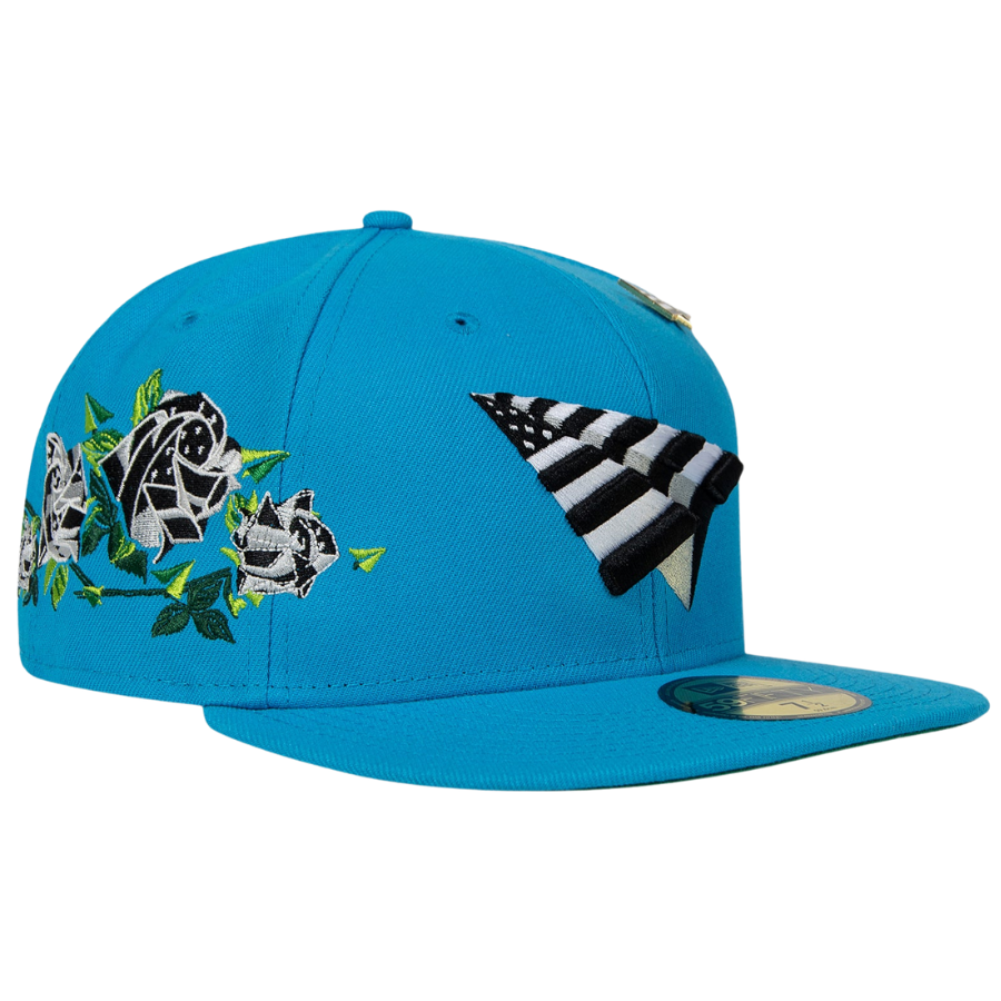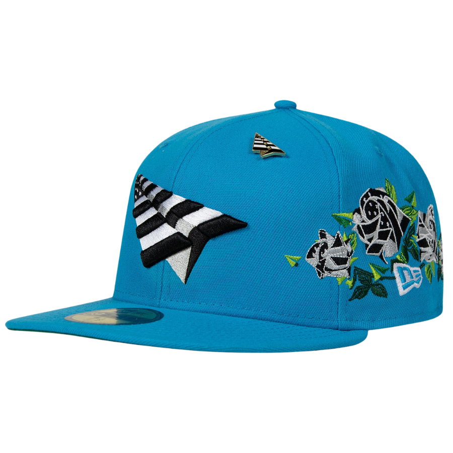 This Paper Planes fitted hat has a blue fanatic six panel structured high crown and embroidered eyelets with a blue fanatic fabric squatchee button. The flat bill of the cap is blue fanatic with a kelly green undervisor and black sweatband. The front panel features the Paper Planes logo embroidery and a black rose side patch embroidery on the right panel. The left panel of the fitted displays the New Era logo with black roses and the official Planes embroidery on the rear crown.
