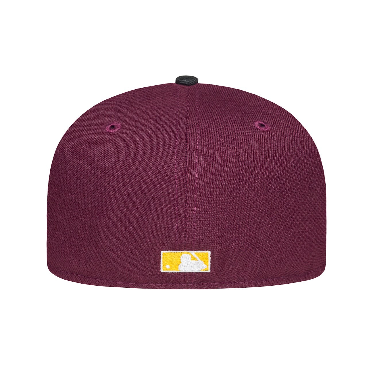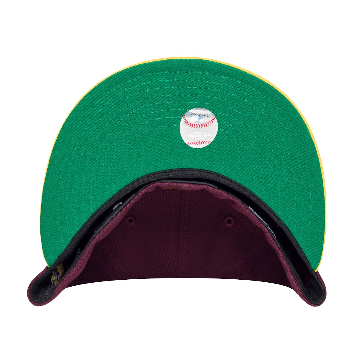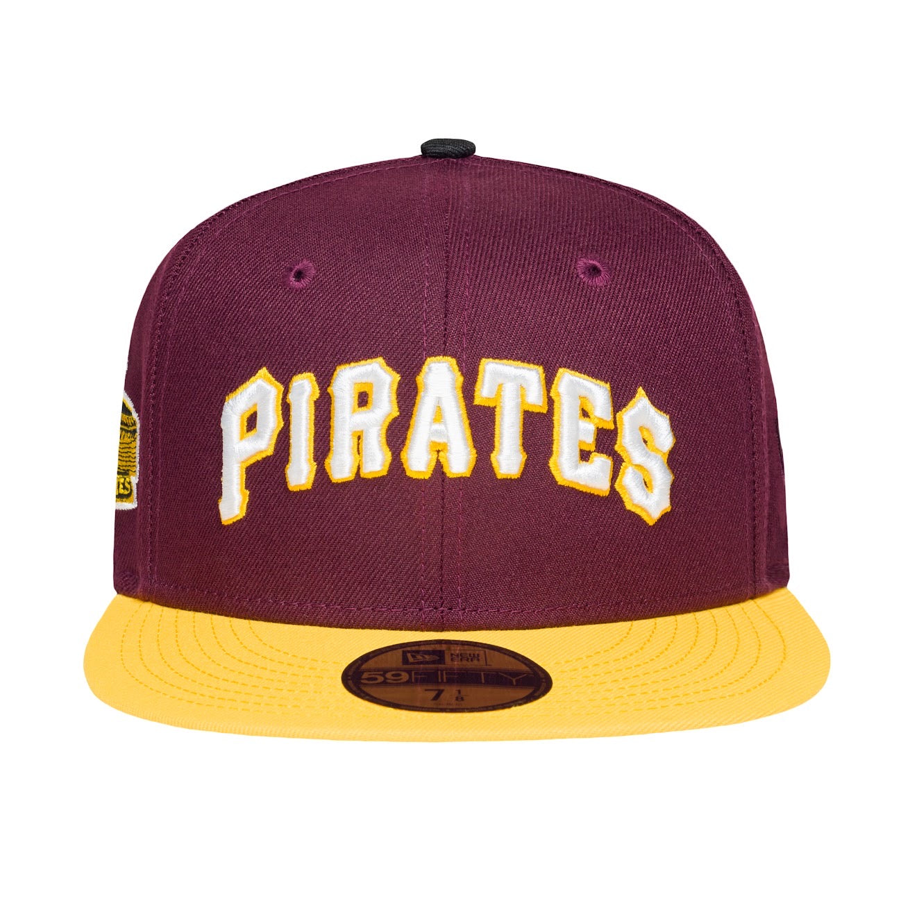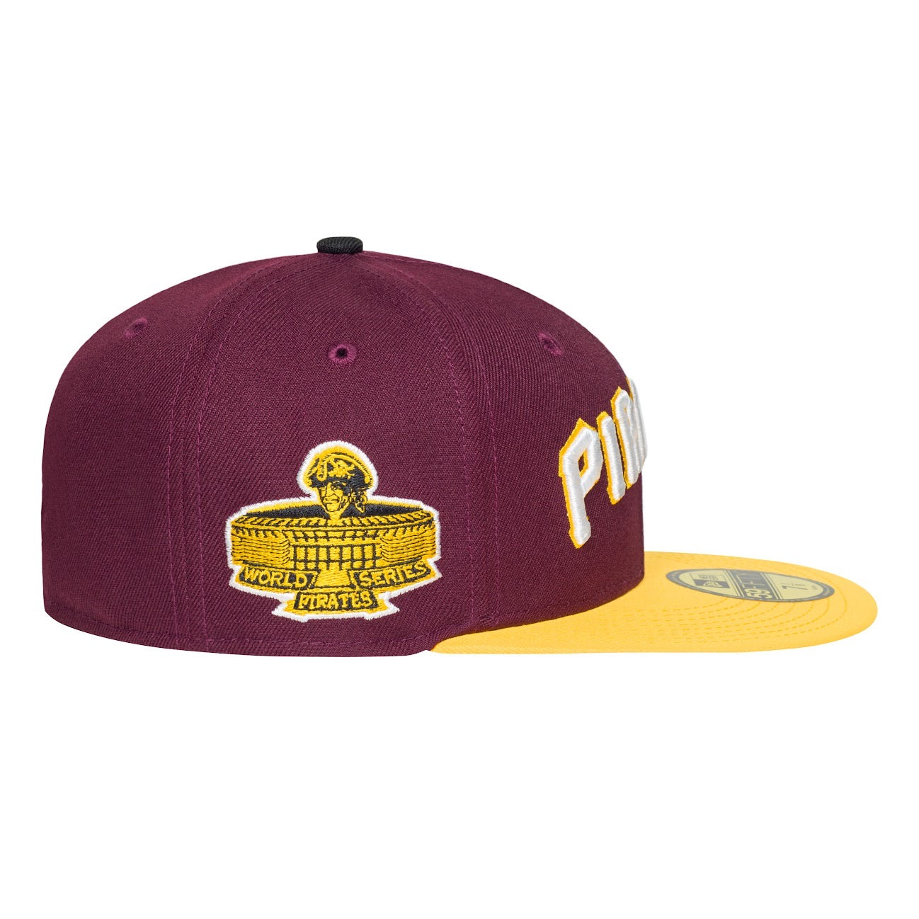 This Pittsburgh Pirates fitted hat was released by Leaders 1354. The fitted has a maroon six panel structured high crown and embroidered eyelets with a black fabric squatchee button. The flat bill of the cap is yellow/gold with a kelly green undervisor and black sweatband. The front panel features the Pittsburgh Pirates logo embroidery and a World Series side patch embroidery on the right panel. The left panel of the fitted displays the New Era logo and the official MLB Batterman logo embroidery on the rear crown.