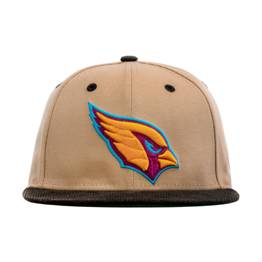 This New Era x SP 'Desert Sky' Arizona Cardinals 2023 59FIFTY Fitted Hat was released by Shoe Palace. The fitted has a tan six panel structured high crown and black embroidered eyelets with a black fabric squatchee button. The flat bill of the fitted cap is also black corduroy with a green undervisor and white sweatband. The front panel features the Arizona Cardinals logo embroidery. The left panel of the fitted displays the New Era logo and the NFL shield and desert cactus embroidered on the rear crown.