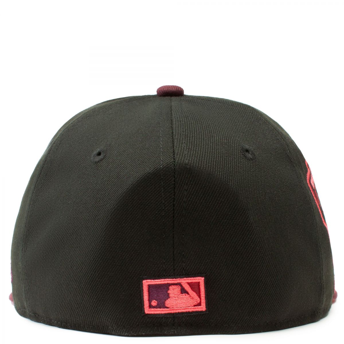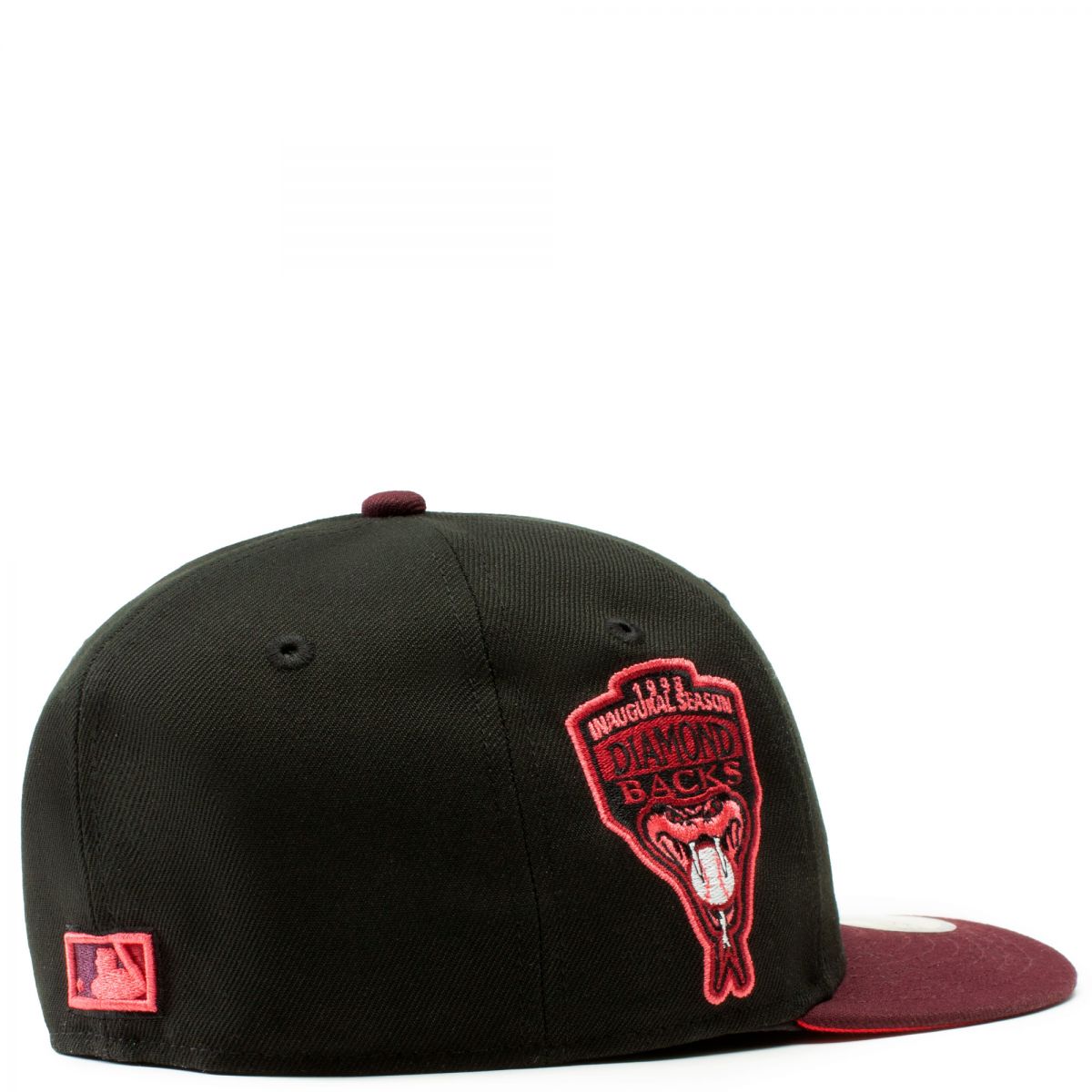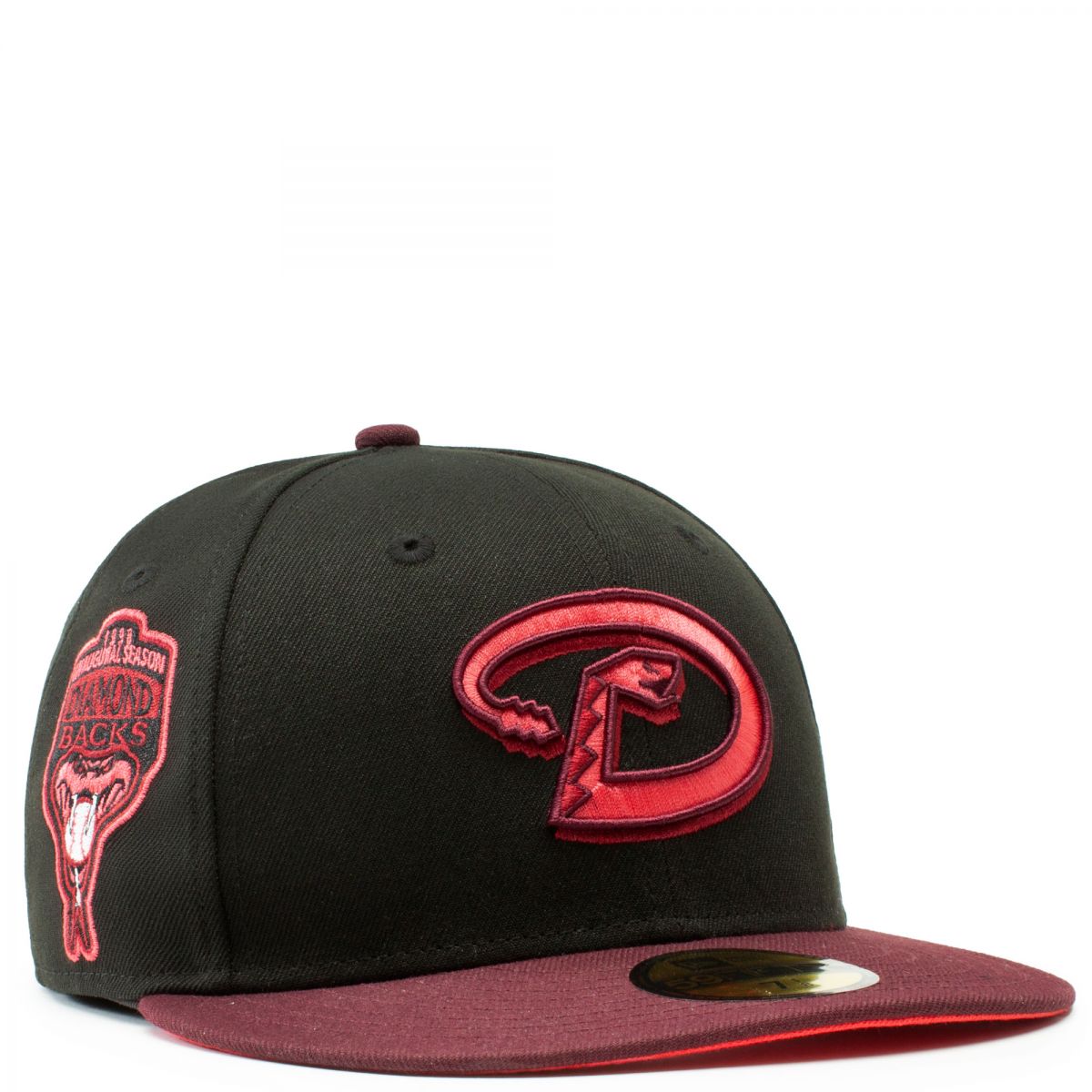 This New Era Arizona Diamondbacks Black/Maroon 1998 Inaugural Season 59FIFTY Fitted Hat has a black six panel structured high crown and embroidered eyelets with a maroon fabric squatchee button. The fitted cap has a maroon flat bill with a lava undervisor. The front panel features the Arizona Diamondbacks logo embroidery and a 1998 Inaugural Season side patch embroidery on the right panel. The left panel of the fitted displays the New Era logo and the official MLB logo embroidery on the rear crown.