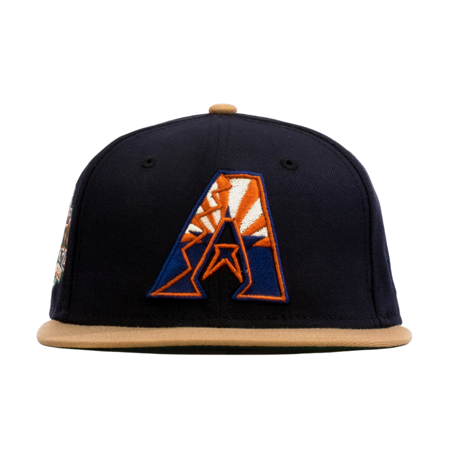 This New Era Arizona Diamondbacks 'Varsity Blues' 2023 59FIFTY Fitted Hat was released by Shoe Palace. The fitted has a navy blue six panel structured high crown and embroidered eyelets with a khaki fabric squatchee button. The flat bill of the fitted cap is also khaki with a pine green undervisor and black sweatband. The front panel features the Arizona Diamondbacks logo embroidery and a side patch on the right panel. The left panel of the fitted displays the New Era logo and the MLB