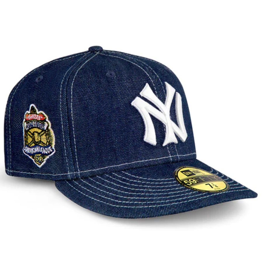This New York Yankees fitted hat was released by Cap USA. The fitted has a blue denim six panel structured high crown and embroidered eyelets with a denim fabric squatchee button. The fitted cap also has a denim brim. The front panel features the New York Yankees logo embroidery and a 1927 World Series side patch embroidery on the right panel.