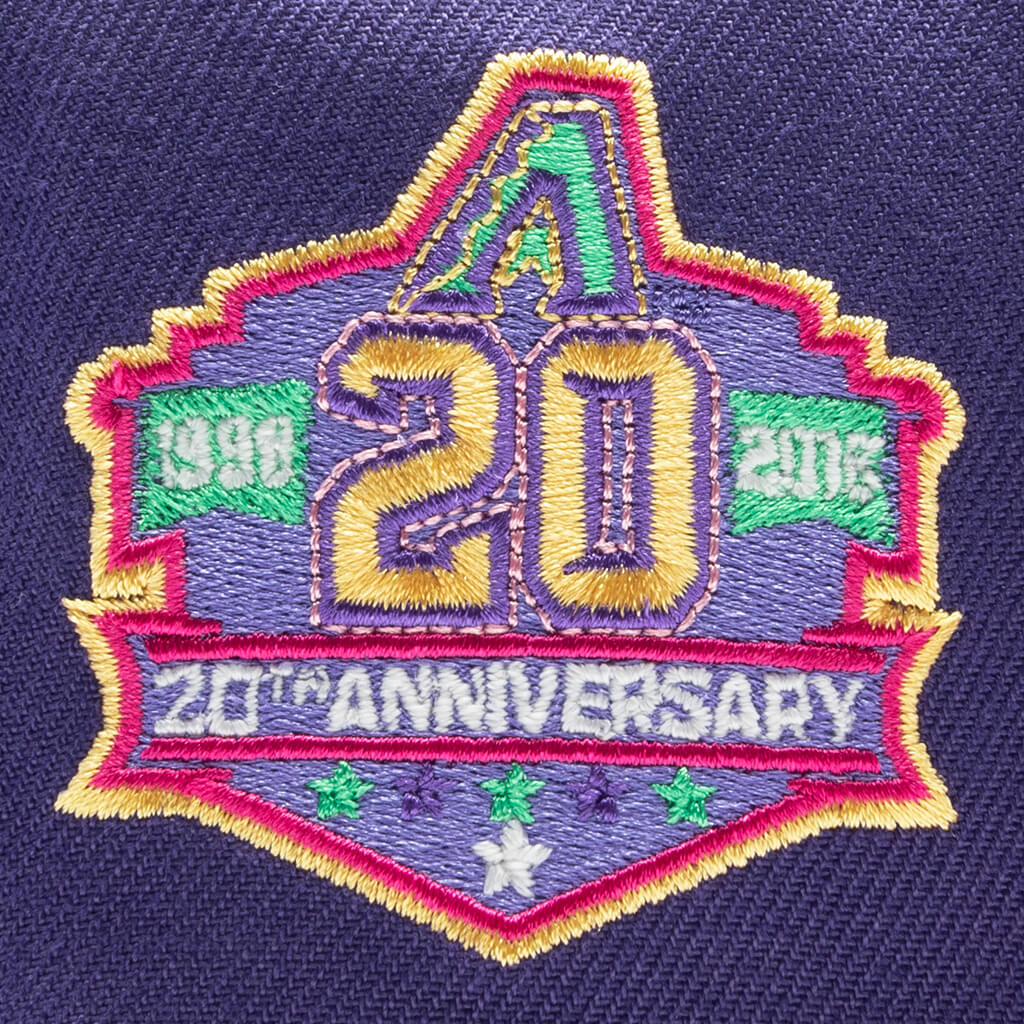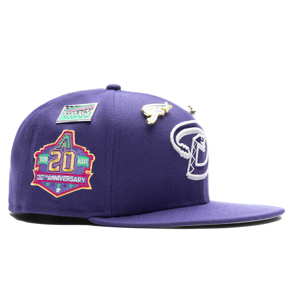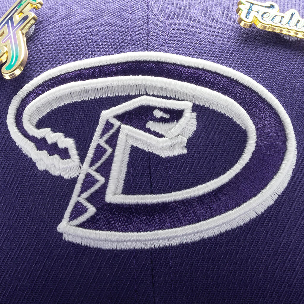 This New Era x Feature Arizona Diamondbacks Northern Lights 59FIFTY Fitted Hat was released by Feature. The Northern Lights fitted has a light navy blue six panel structured high crown, grey embroidered eyelets and light navy blue flat bill. The fitted cap has a grey bottom undervisor with a black sweatband . The front panel features the Arizona Diamondbacks logo embroidery and a side patch embroidered on the right panel. The left panel of the fitted displays the New Era logo and the official MLB logo embroidery on the rear crown.