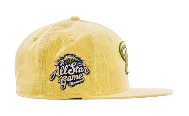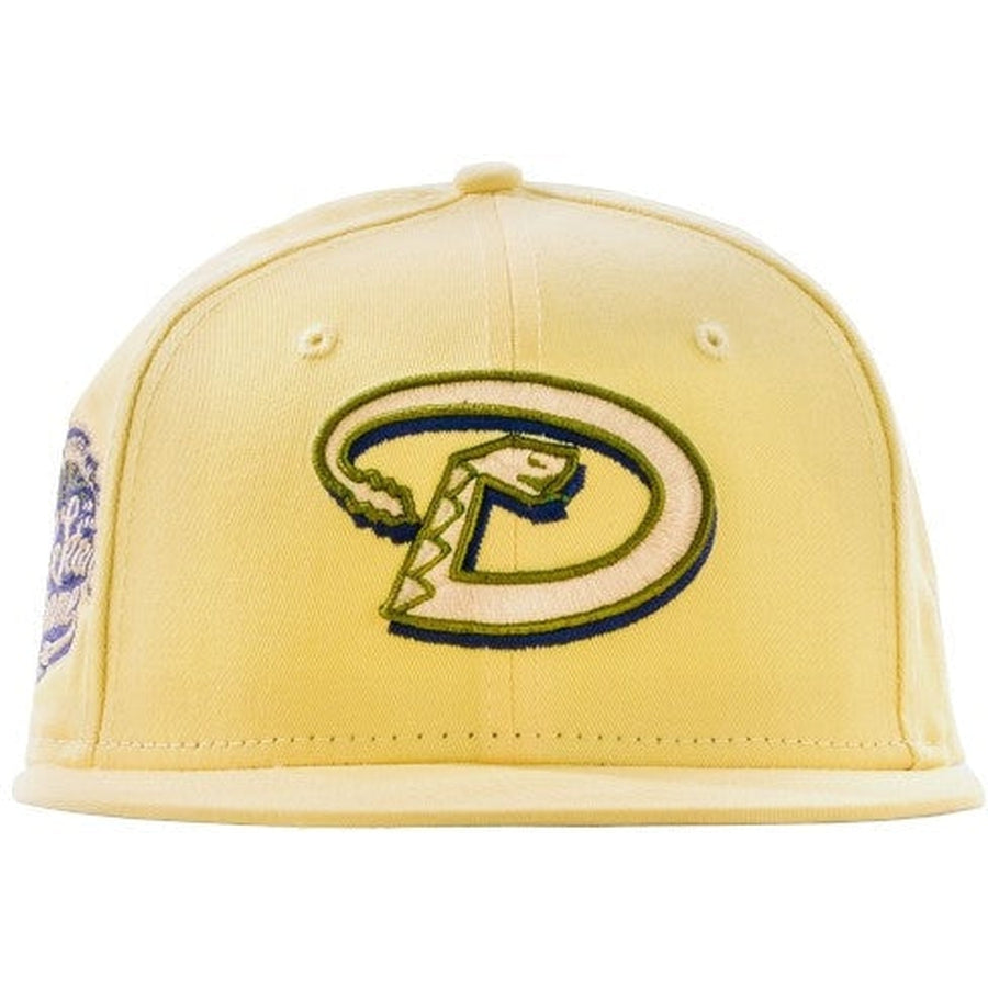 This New Era Arizona Diamondbacks 59FIFTY fitted hat is a Shoe Palace exclusive drop. The six panel structured high crown, embroidered eyelets and fabric squatchee button is soft Canary Yellow. The flat bill of the fitted cap is also soft yellow with a grey undervisor and black sweatband. The front and right panel features navy blue threads.
