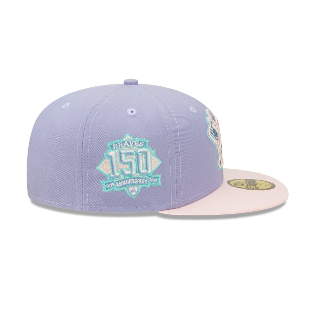 This Atlanta Braves fitted hat was released by Burdeens Chicago. The fitted has a lavender six panel structured high crown and embroidered eyelets with a lavender fabric squatchee button. The flat bill of the cap is soft pink with a teal undervisor and white sweatband. The front panel features the Atlanta Braves logo embroidery and a 150th Anniversary side patch embroidery on the right panel. The left panel of the fitted displays the New Era logo and the official MLB Batterman logo embroidery on the rear crown.
