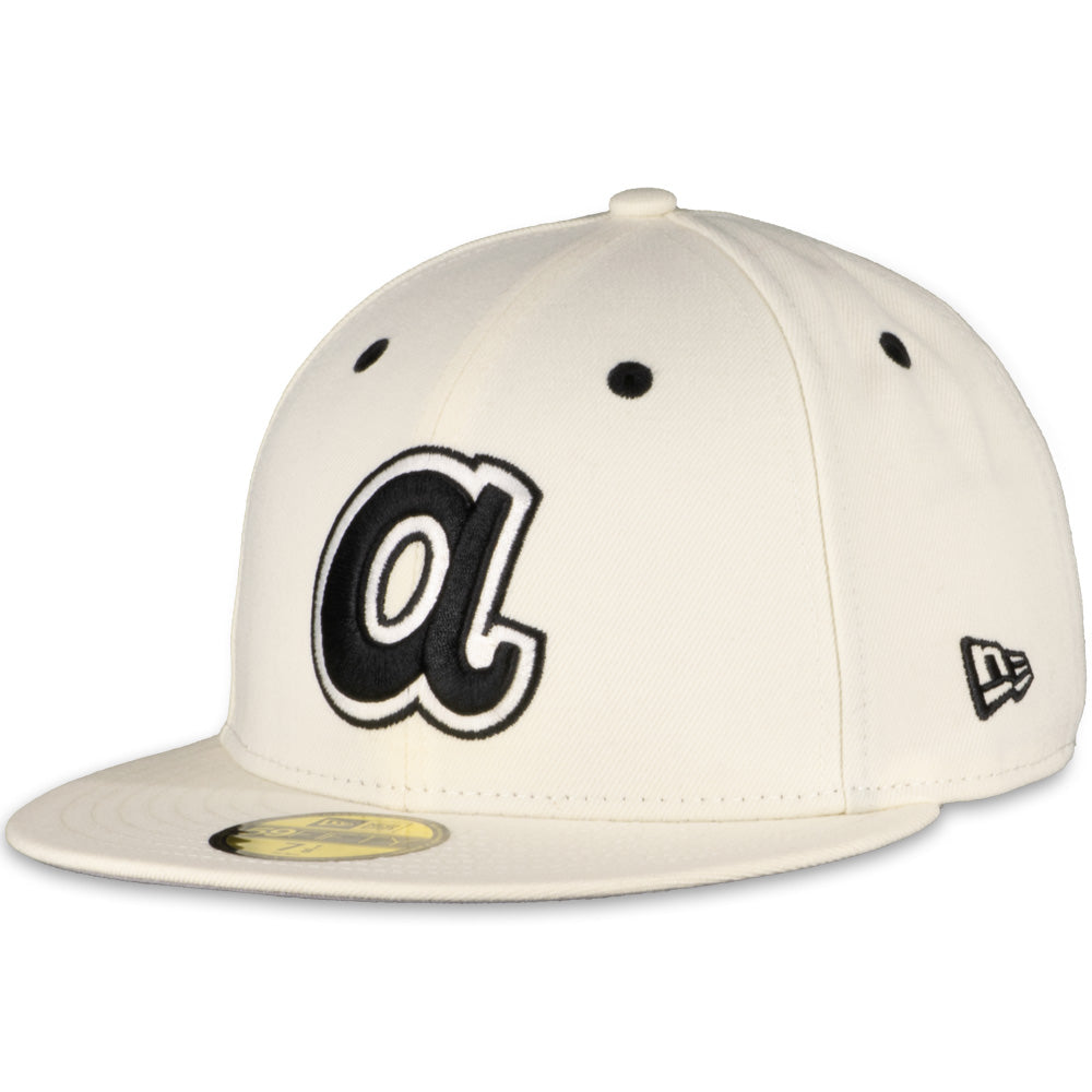 This Atlanta Braves fitted hat was released by Just Sports. The fitted has a ivory six panel structured high crown and embroidered eyelets with an ivory fabric squatchee button. The flat bill of the cap is also ivory with an undervisor and sweatband. The front panel features the Atlanta Braves logo embroidery and a side patch embroidery on the right panel. The left panel of the fitted displays the New Era logo and the official MLB logo embroidery on the rear crown.