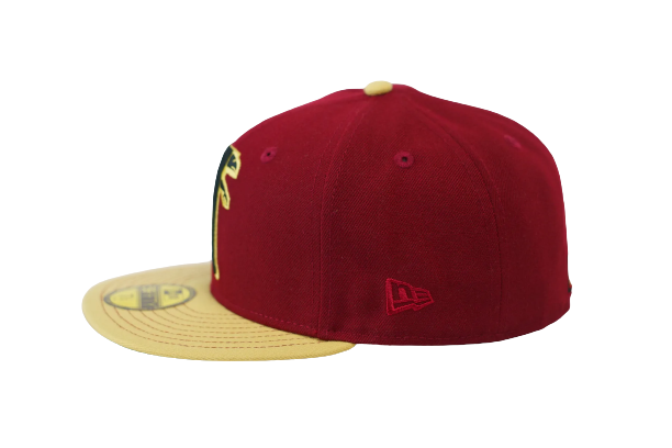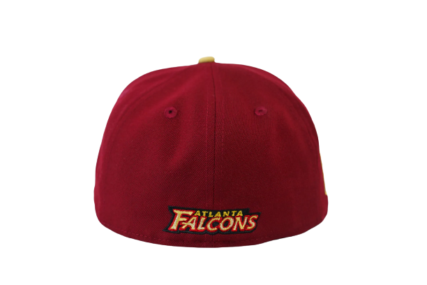 This New Era Atlanta Falcons Burgundy 1993 Pro Bowl ‘Prime Time’ 59FIFTY Fitted Hat has a burgundy six panel structured high crown and embroidered eyelets with a burgundy fabric squatchee button. The fitted cap has a vegas gold flat bill with a green undervisor and white sweatband. The front panel features the Atlanta Falcons logo embroidery and a 1993 Pro Bowl side patch embroidery on the right panel. The left panel of the fitted displays the New Era logo and the official NFL logo embroidery on the rear crown.