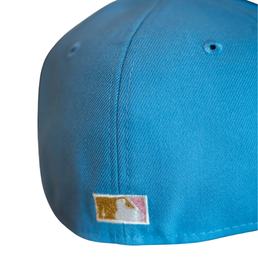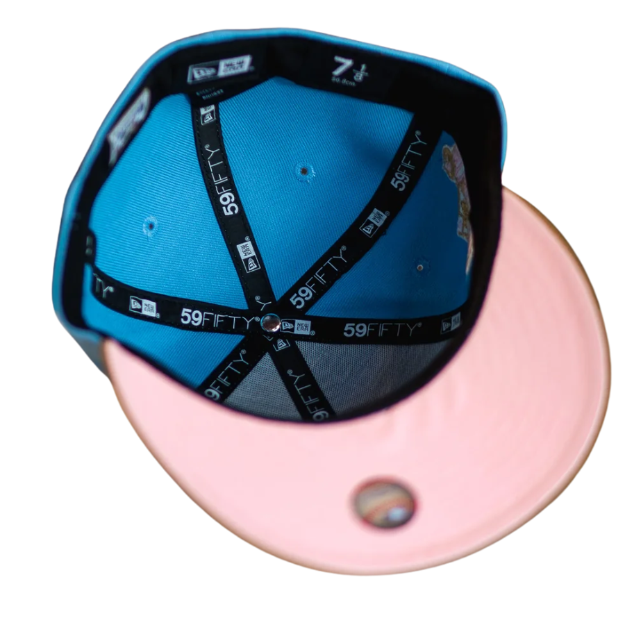 This New Era 59FIFTY Anaheim Angels fitted hat was released by Sneaker Town. The fitted has a sky blue six panel structured high crown and embroidered eyelets with a wheat fabric squatchee button. The flat bill of the fitted is wheat with a soft pink undervisor. The front panel features a wheat stitched Anaheim Angels script logo embroidery with a 1989 All-Star Game side patch on the right-wear side.