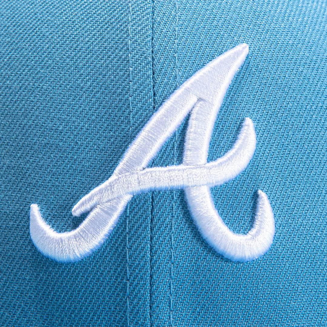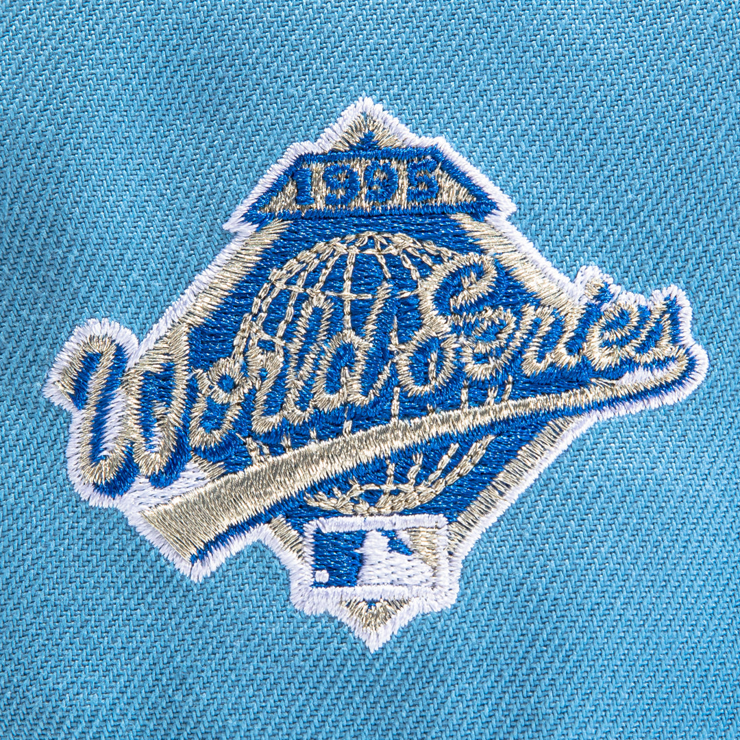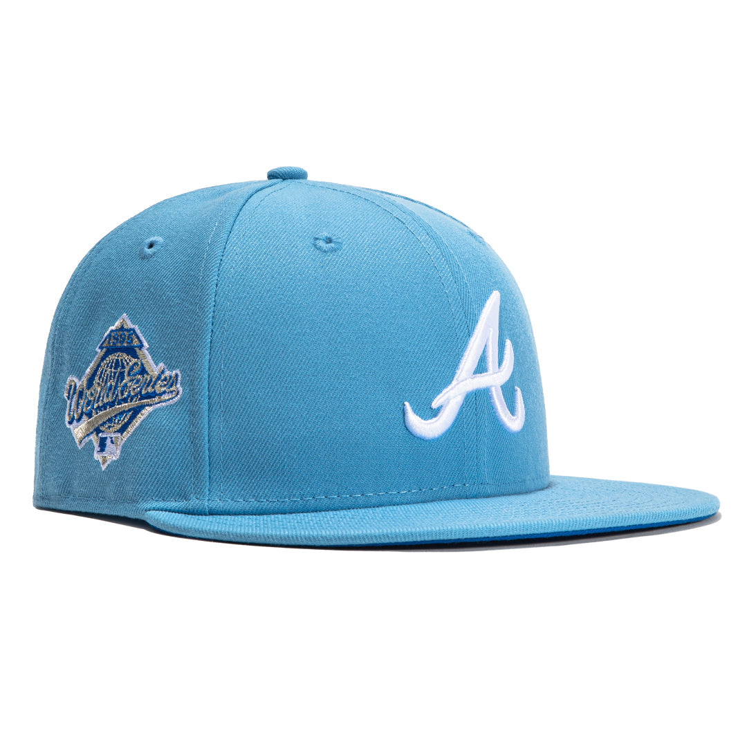 This New Era Iceberg Atlanta Braves 1995 World Series 2022 59FIFTY Fitted Hat has a sky blue six panel structured high crown and embroidered eyelets with a sky blue fabric squatchee button. The fitted cap has a sky blue flat bill with a royal blue undervisor and black sweatband. The front panel features the Atlanta Braves logo embroidery and a 1995 World Series side patch on the right panel. The left panel of the fitted displays the New Era logo and the official MLB logo embroidery on the rear crown.