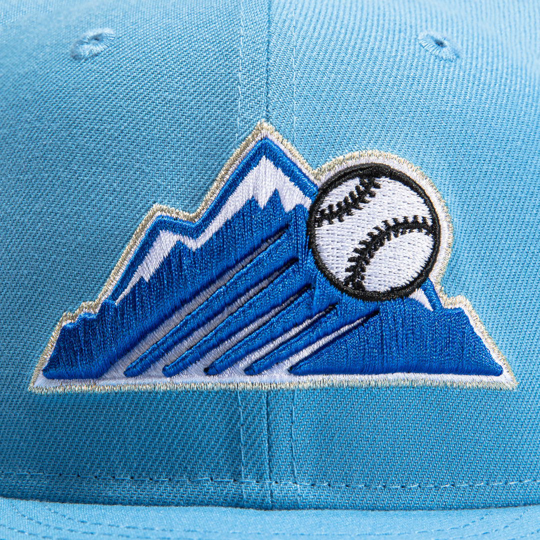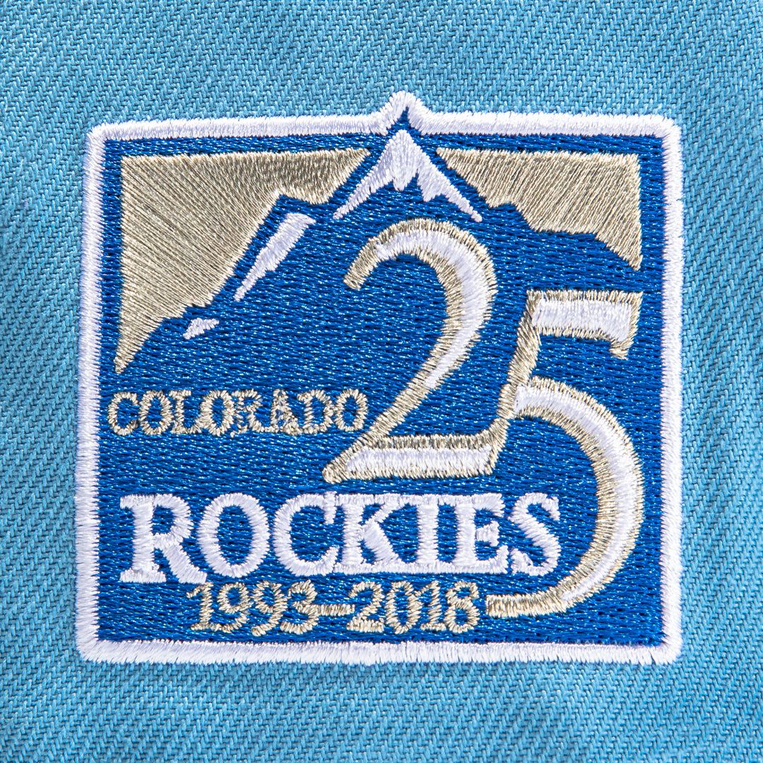 This New Era Iceberg Colorado Rockies 25th Anniversary 2022 59FIFTY Fitted Hat has a sky blue six panel structured high crown and embroidered eyelets with a sky blue fabric squatchee button. The fitted cap has a sky blue flat bill with a royal blue undervisor and black sweatband. The front panel features the Colorado Rockies logo embroidery and a 25th Anniversary side patch on the right panel. The left panel of the fitted displays the New Era logo and the official MLB logo embroidery on the rear crown.