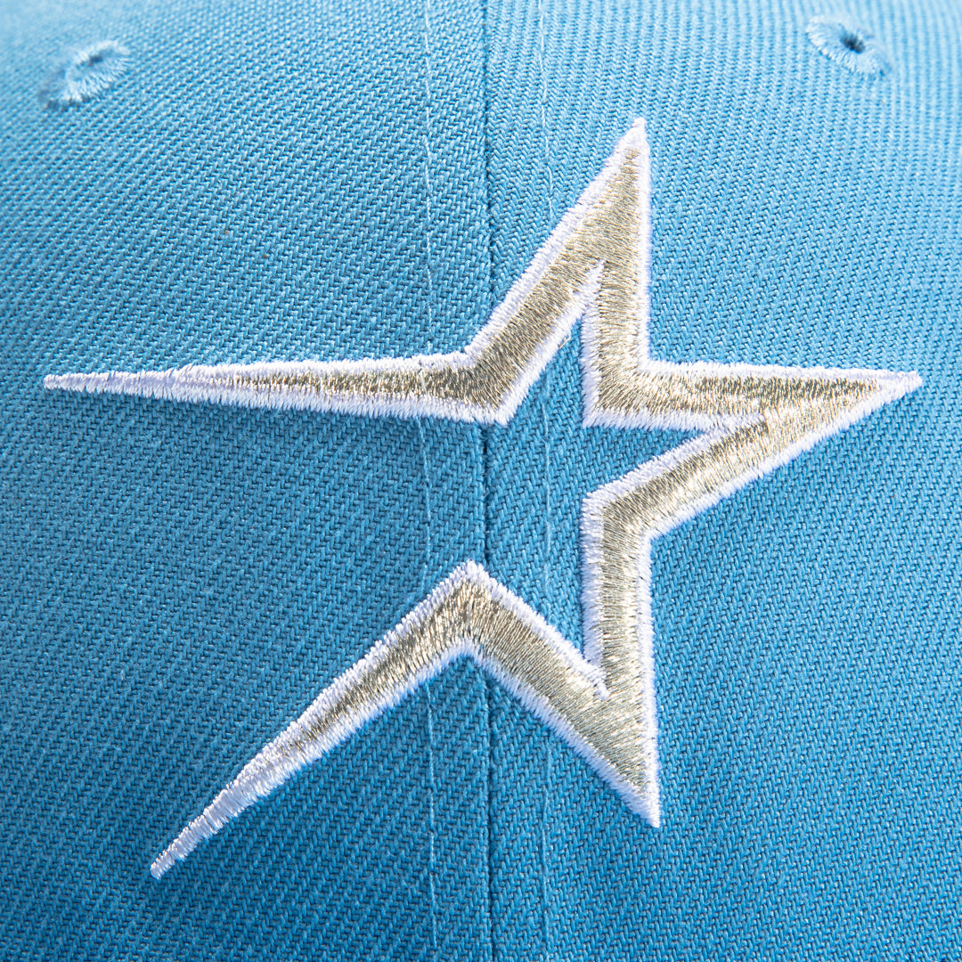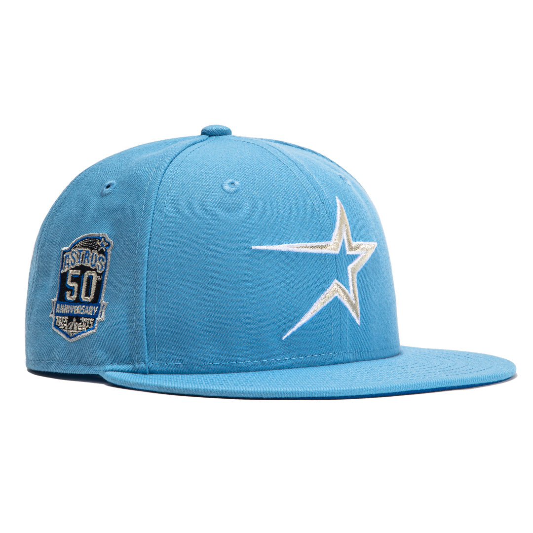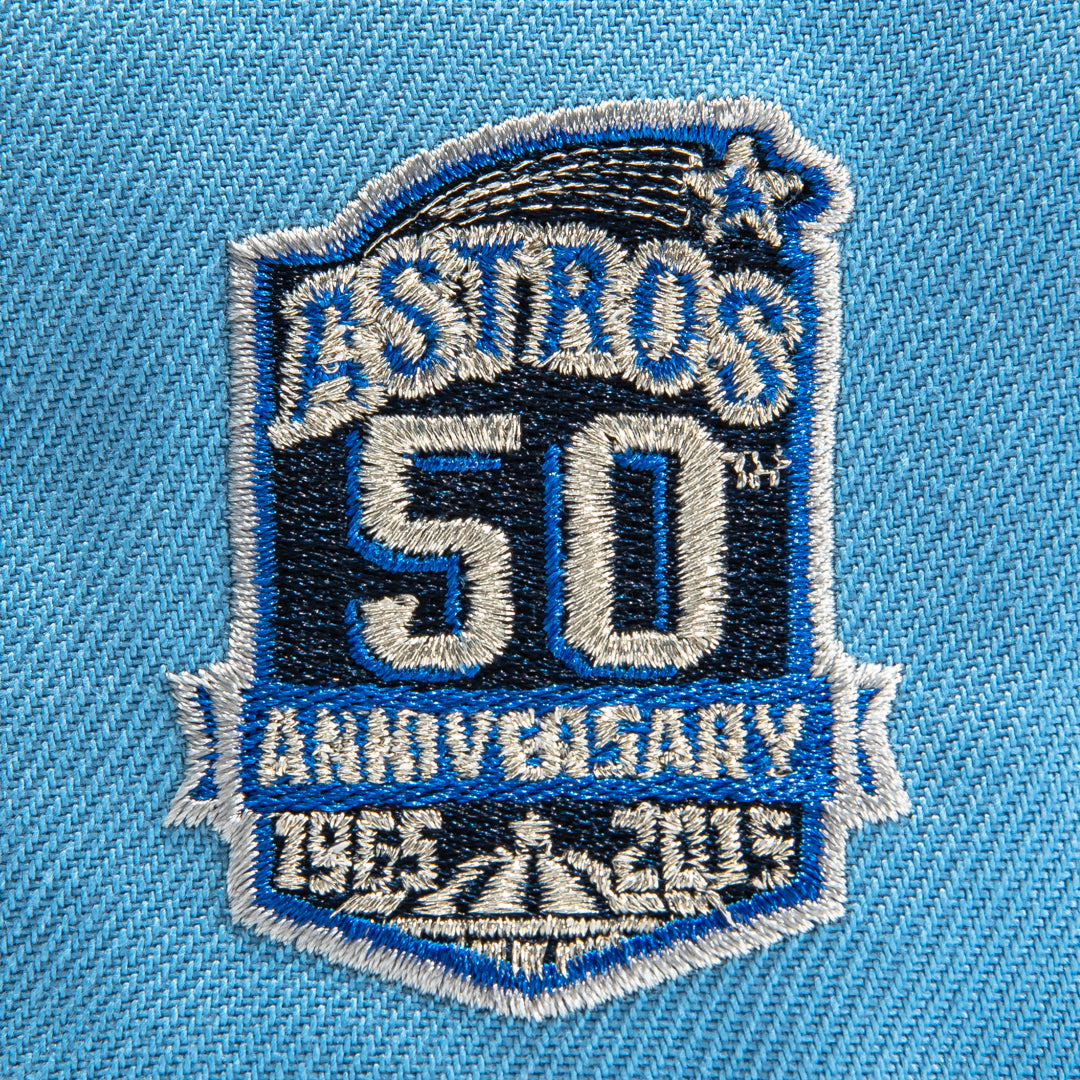 This New Era Iceberg Houston Astros 50th Anniversary 2022 59FIFTY Fitted Hat has a sky blue six panel structured high crown and embroidered eyelets with a sky blue fabric squatchee button. The fitted cap has a sky blue flat bill with a royal blue undervisor and black sweatband. The front panel features the Houston Astros logo embroidery and a 50th Anniversary side patch on the right panel. The left panel of the fitted displays the New Era logo and the official MLB logo embroidery on the rear crown.