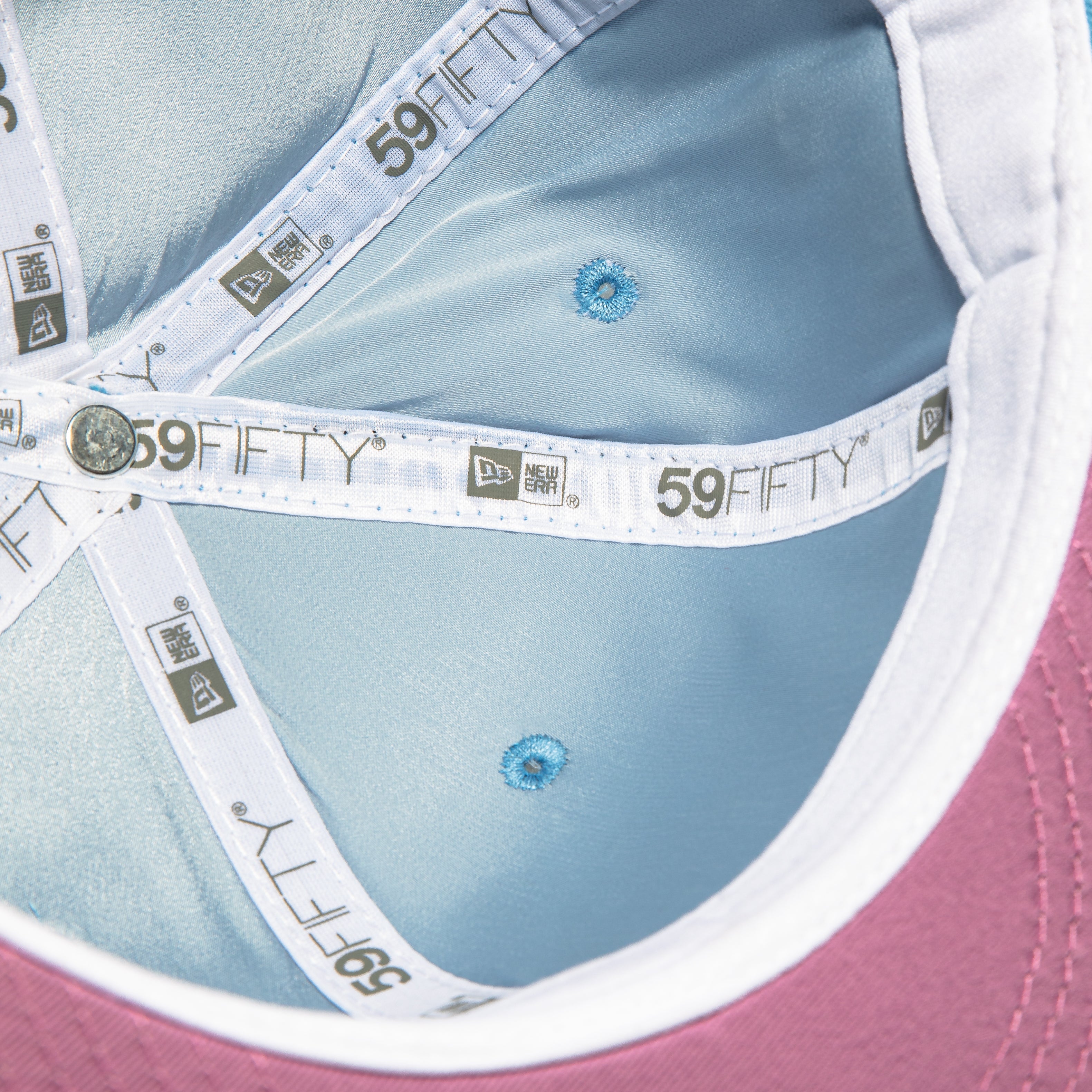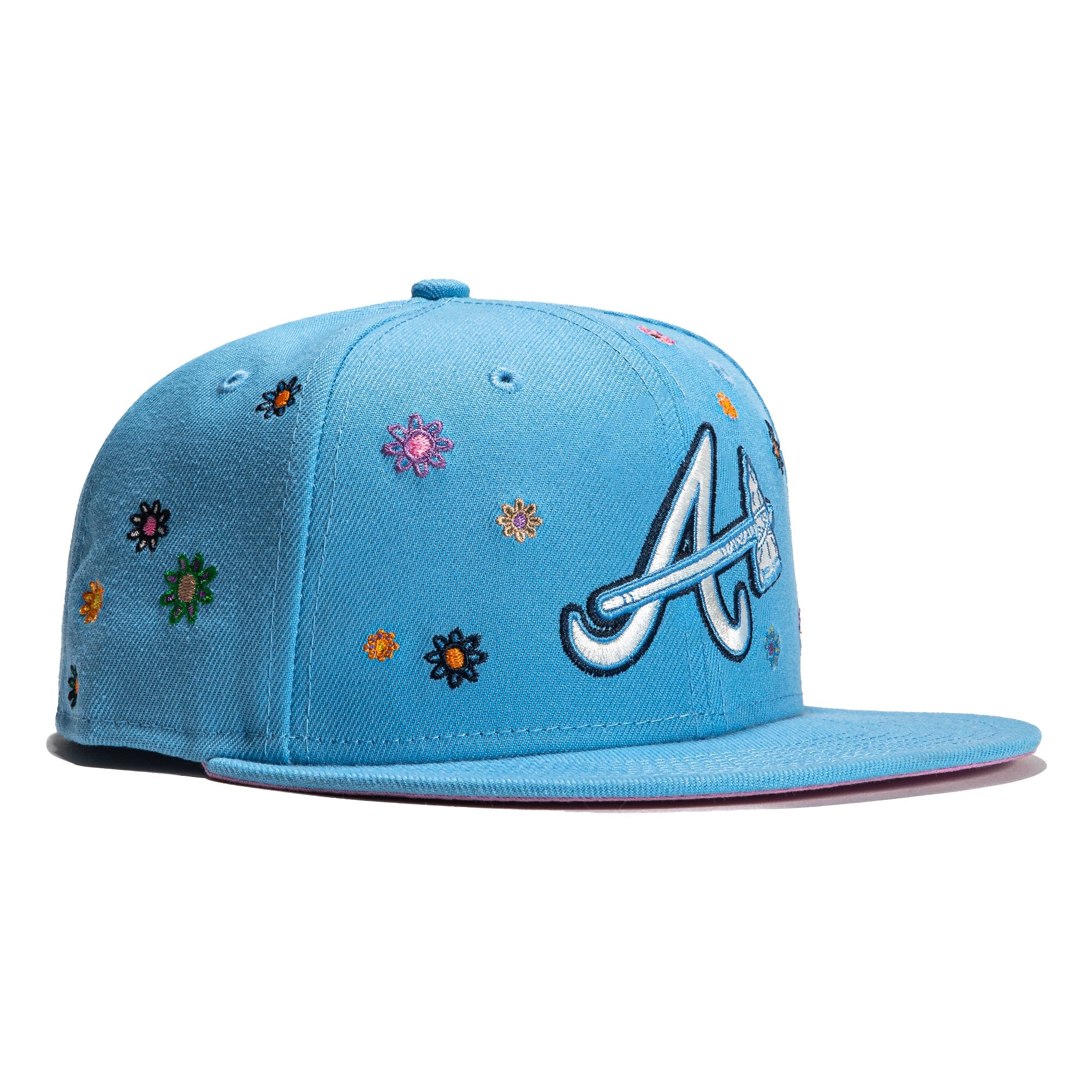 This New Era Super Bloom 2 Atlanta Braves 2022 59FIFTY Fitted Hat is a Hat Club exclusive. The fitted has a light blue six panel structured high crown and embroidered eyelets with a light blue fabric squatchee button. The fitted also has light blue flat bill with a pink undervisor. The front panel features the Atlanta Braves logo embroidery and with all-over bloom floral patterns. The left panel of the fitted displays the New Era logo and the official MLB logo embroidery on the rear crown.