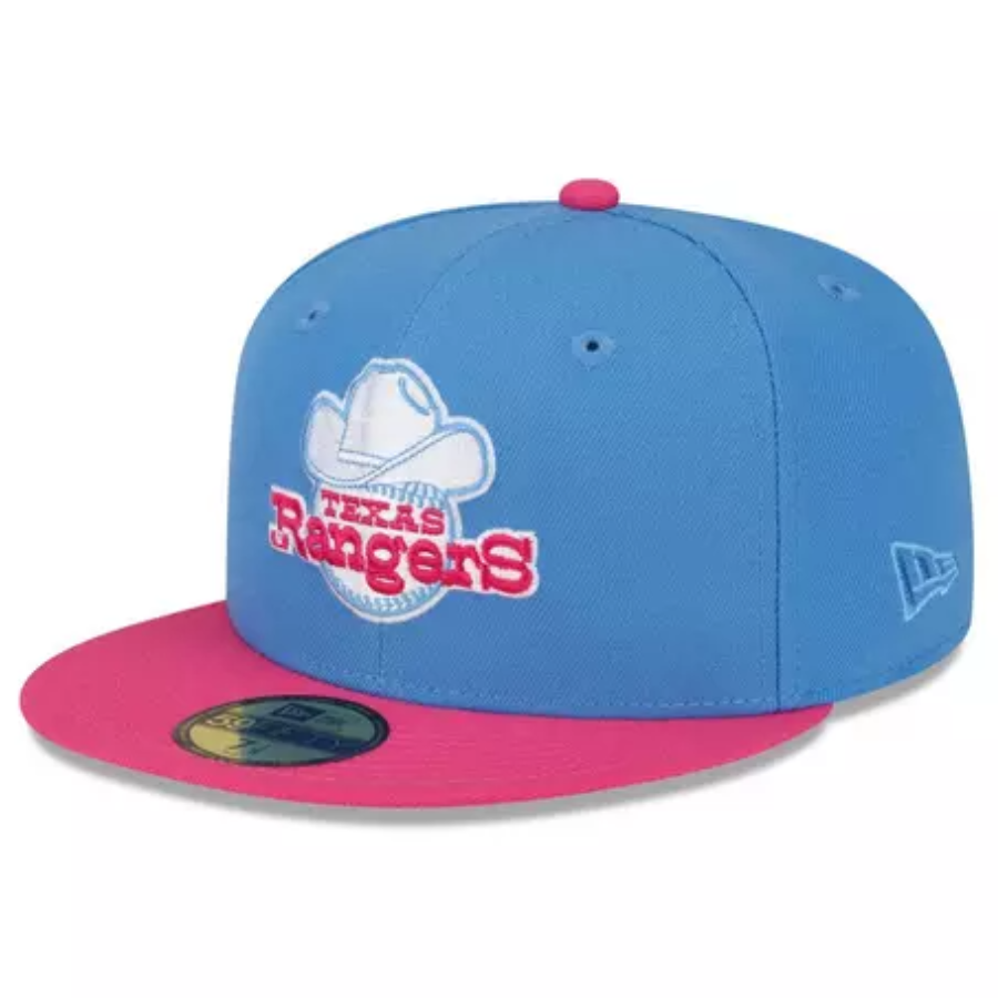 This New Era Texas Rangers Gummy Worm Pack 59FIFTY fitted hat is a Hibbett exclusive release. The fitted has a baby blue six panel structured high crown and embroidered eyelets with a magenta pink fabric squatchee button. The flat bill of the fitted is also magenta. The front panel features the Rangers logo embroidered in baby blue, hot pink and white stitching.