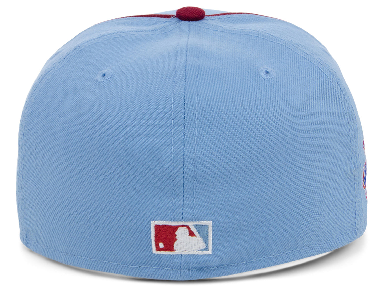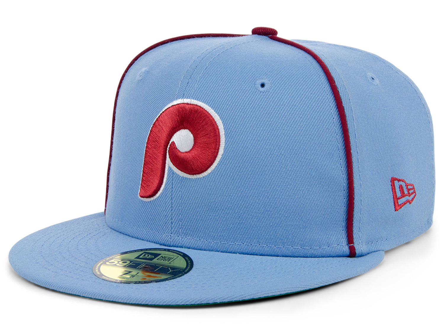 Lids Hat Drop is excited to bring unique and exclusive colorways to your favorite MLB team. This New Era Philadelphia Phillies Powder Blue Pipe 59FIFTY fitted cap is a high crown hat structured with a flat rounded bill, threaded rivets, and a team patch to highlight the achievements. Find the look that fits your collection or wardrobe.