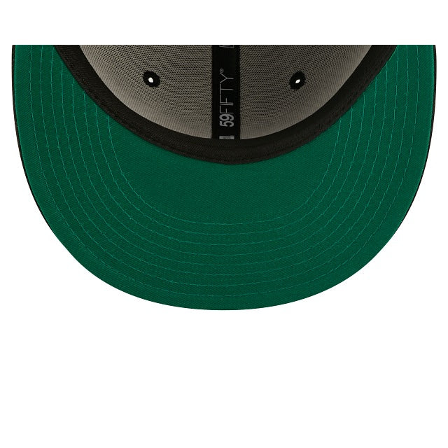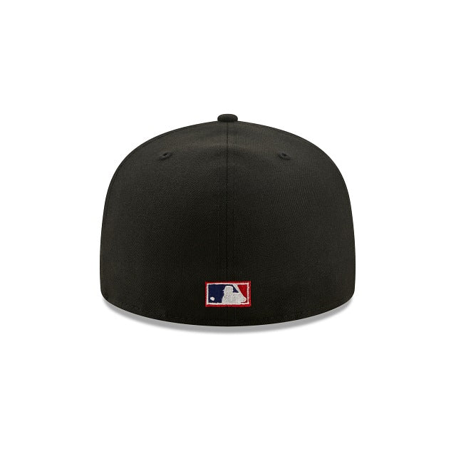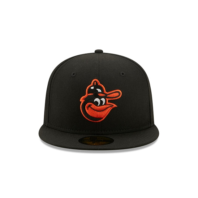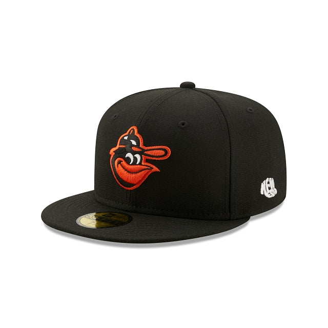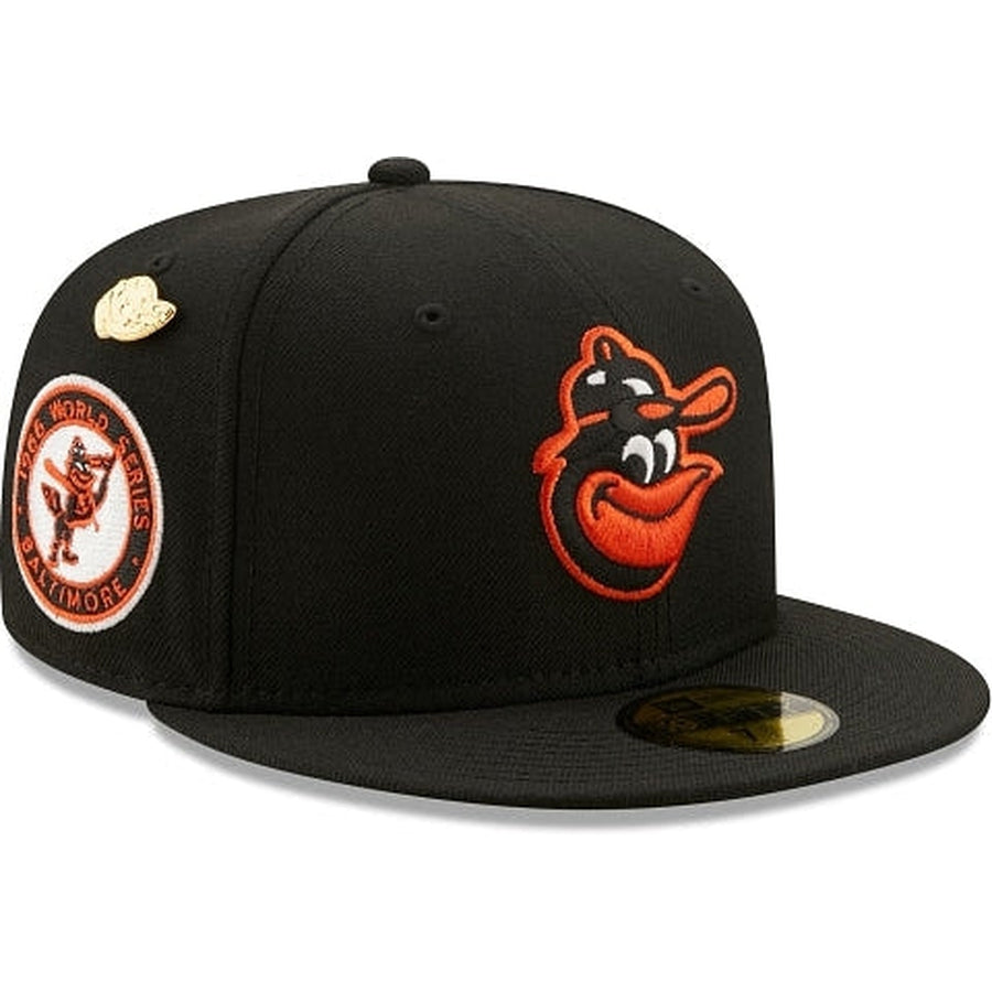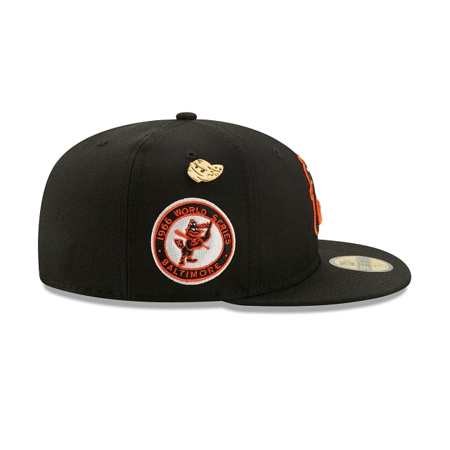 The Baltimore Orioles 1966 Logo History 59FIFTY Fitted Cap features an embroidered Orioles logo at the front panels, a 1966 World Series patch and New Era pin at the right-wear side, and a matching MLB Batterman logo at the rear. Additional details include a green undervisor.