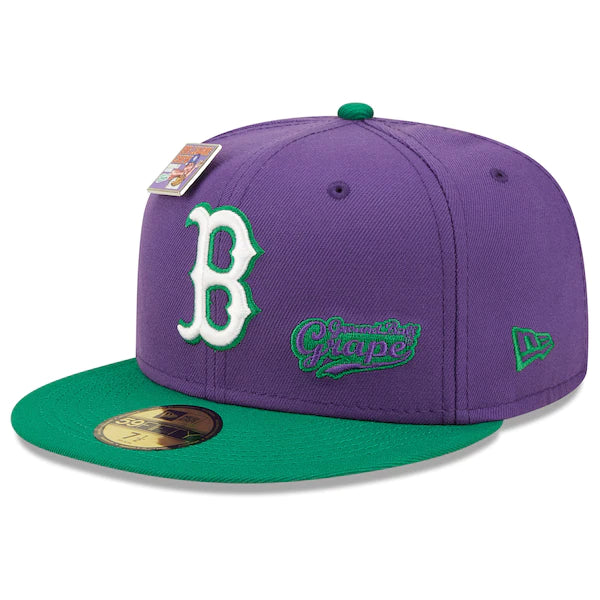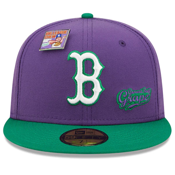 The MLB and Big League Chew have teamed up to bring Boston Red Sox fans this one of a kind, Ground Ball Grape Flavor Pack 59FIFTY Fitted Hat. Featuring a high crown and flat bill, this New Era hat will take your game day look to the next level. Its classic and fun graphics combine your Boston Red Sox and your all-time favorite Big League Chew flavor, making it unlike anything else in your collection.