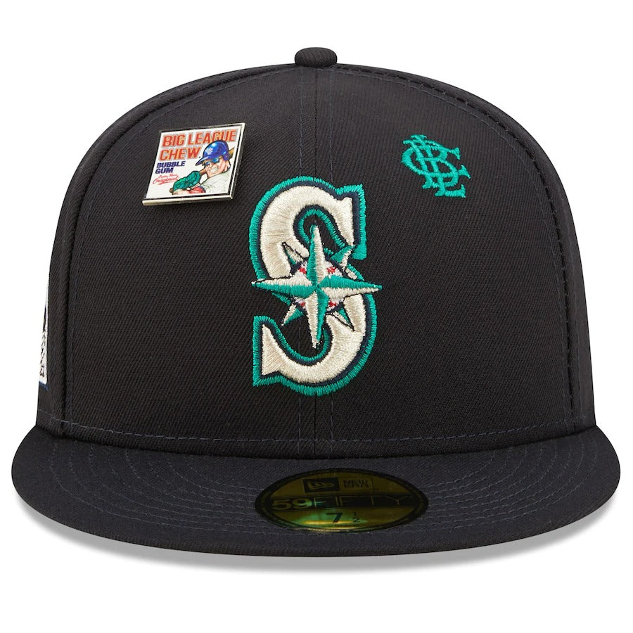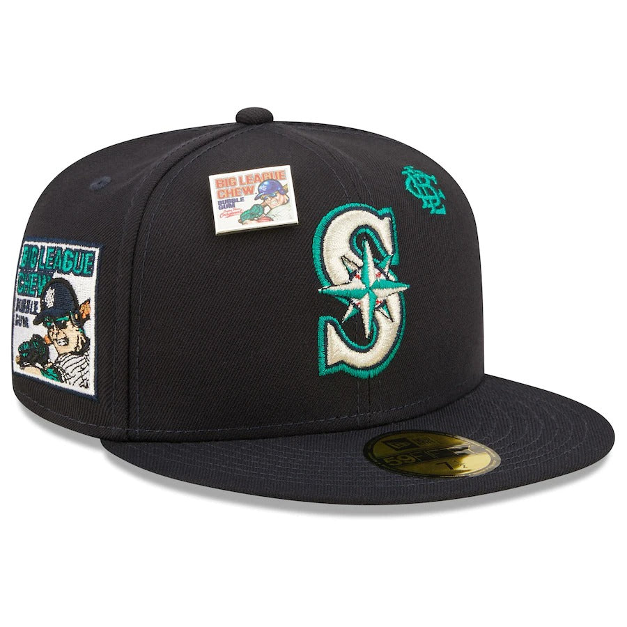 The MLB and Big League Chew have teamed up to bring Seattle Mariners fans this one of a kind, 59FIFTY Fitted Hat. Featuring a high crown and flat bill, this New Era hat will take your game day look to the next level. Its classic Seattle Mariners graphics and Big League Chew details make it unlike anything else in your collection.