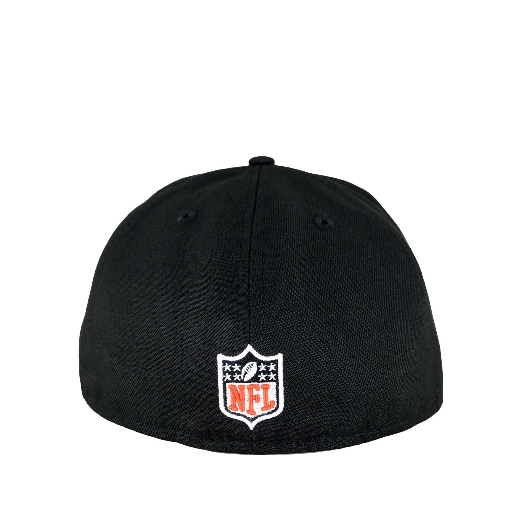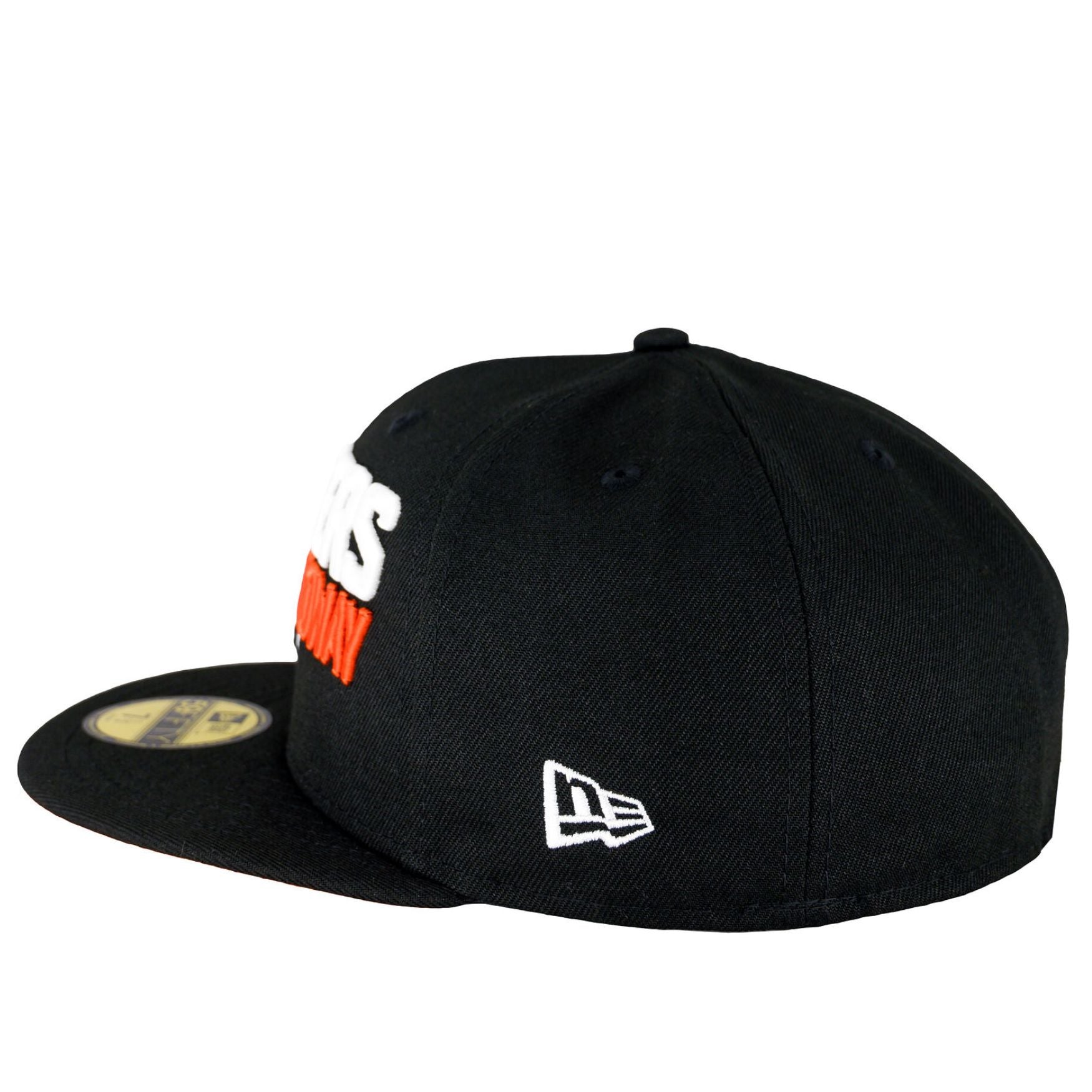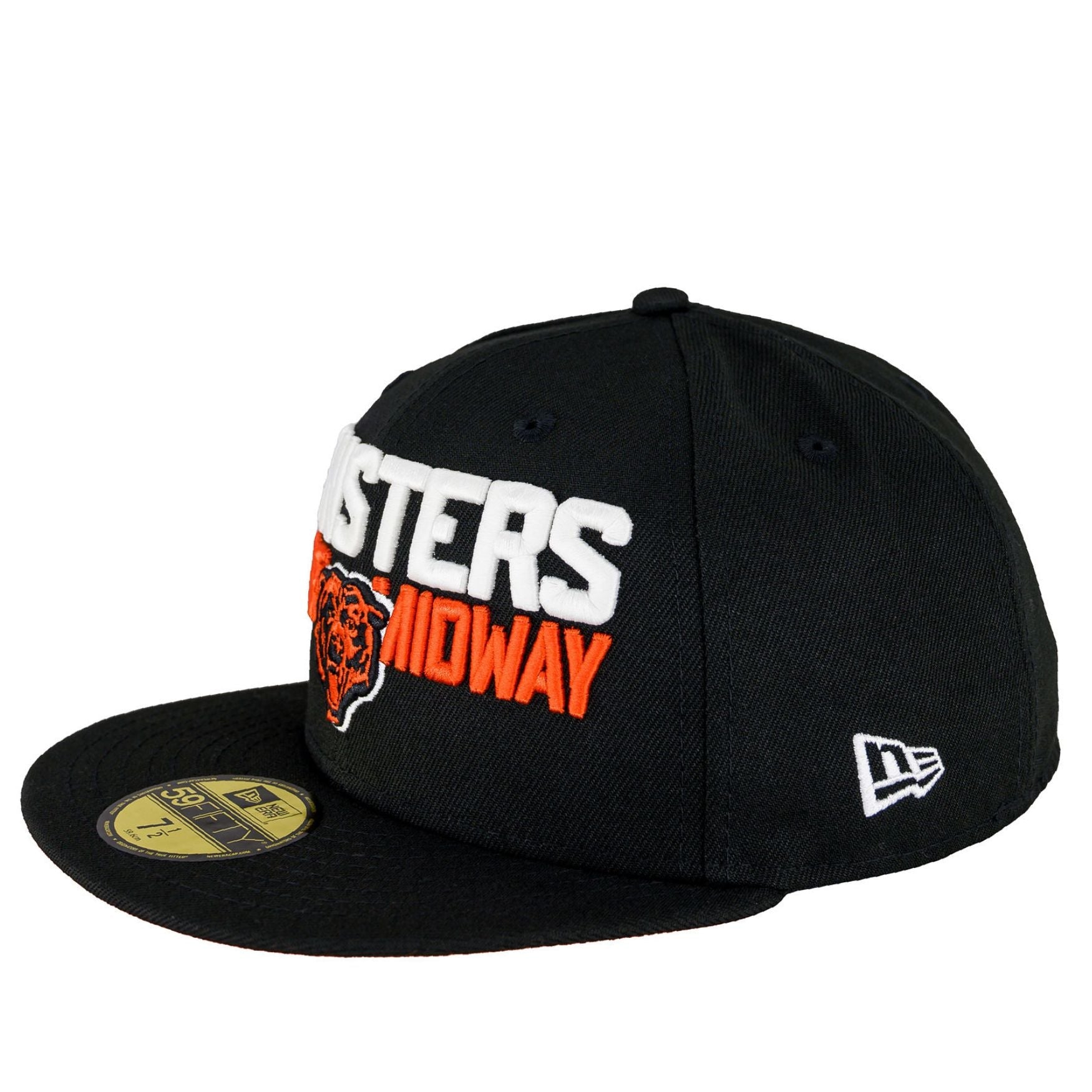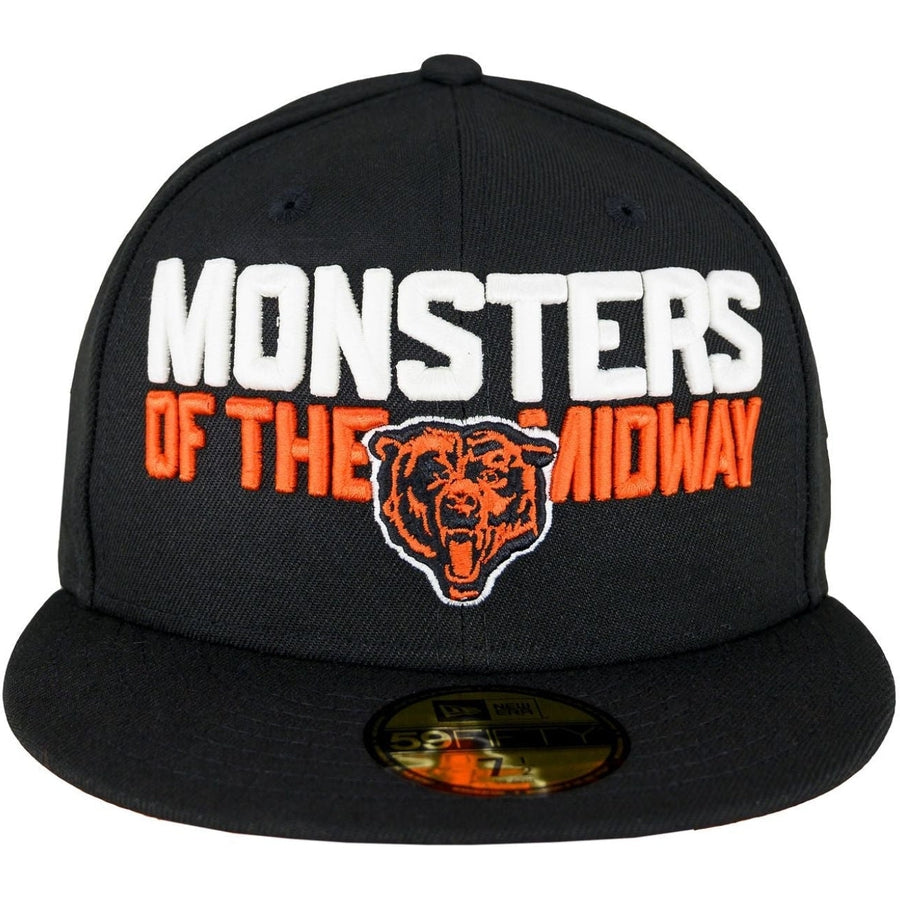 This Chicago Bears fitted hat was released by Clark Street Sports. The fitted has a black six panel structured high crown and embroidered eyelets with a black fabric squatchee button. The flat bill of the cap is black with a orange undervisor and black sweatband. The front panel features the Chicago Bears logo embroidery and " Monsters of The Midway" script. The left panel of the fitted displays the New Era logo and the offical NFL Shield logo embroidery on the rear crown.