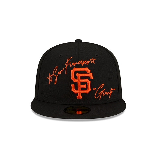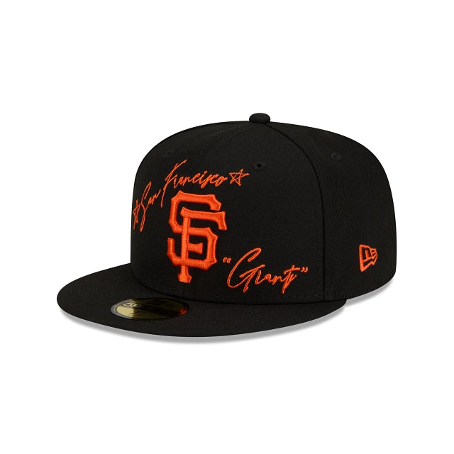 The San Francisco Giants Cursive 59FIFTY Fitted Cap features an embroidered Giants logo with a matching cursive script at the front panels, a World Series patch embroidered at the right-wear side and the MLB Batterman logo at the rear. Additional details include a gray undervisor.