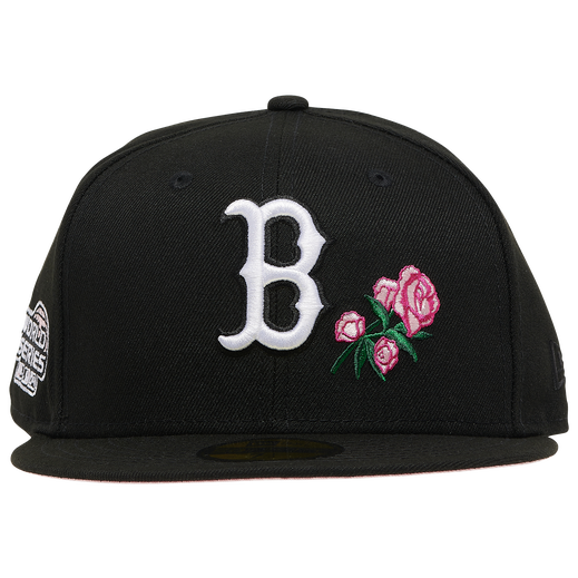 This New Era Boston Red Sox fitted hat has a black six panel structured high crown, embroidered eyelets, fabric squatchee button and flat bill. The undervisor of the fitted cap is pink with a black sweatband. The front panel features the Boston Red Sox logo embroidered in white thread with a pink rose embroidered patch. The right panel features a 2004 World Series side patch embroidery.