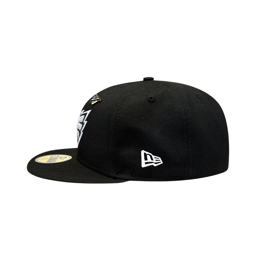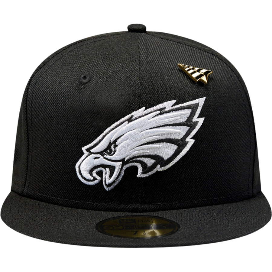 This New Era Paper Planes x Philadelphia Eagles 59FIFTY Fitted Hat is a collaboration between Paper Planes x New Era & the NFL. The fitted has a black six panel structured high crown, embroidered eyelets and fabric squatchee button. The flat bill of the fitted cap is also black with a green undervisor and white sweatband. The front panel features the NFL team logo embroidery. The left panel of the fitted displays the New Era logo and the Paper Planes logo on the right panel. The NFL shield is embroidered on the rear crown.