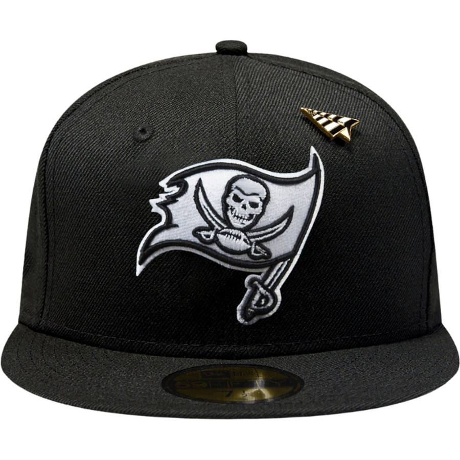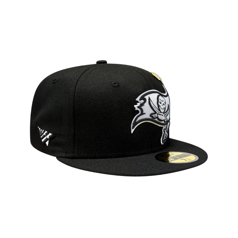 This New Era Paper Planes x Tampa Bay Buccaneers 59FIFTY Fitted Hat is a collaboration between Paper Planes x New Era & the NFL. The fitted has a black six panel structured high crown, embroidered eyelets and fabric squatchee button. The flat bill of the fitted cap is also black with a green undervisor and white sweatband. The front panel features the NFL team logo embroidery. The left panel of the fitted displays the New Era logo and the Paper Planes logo on the right panel. The NFL shield is embroidered on the rear crown.