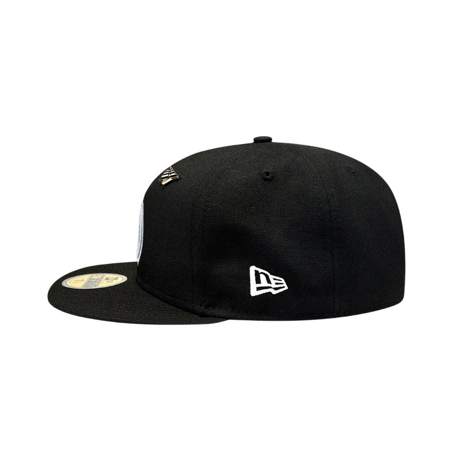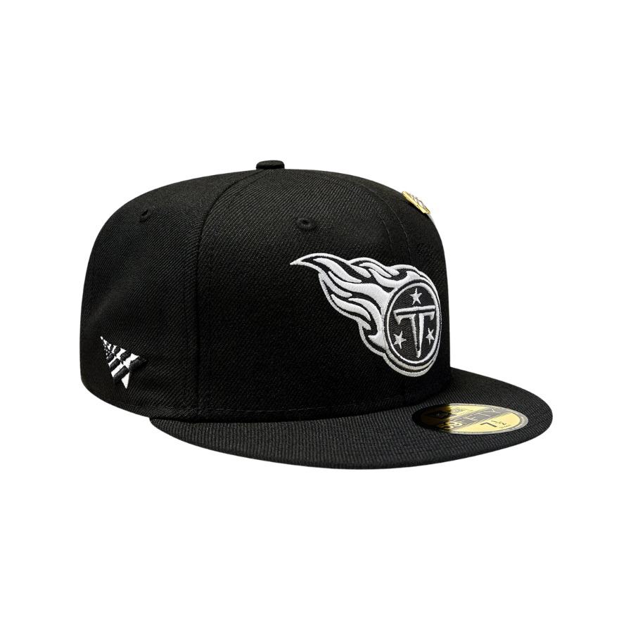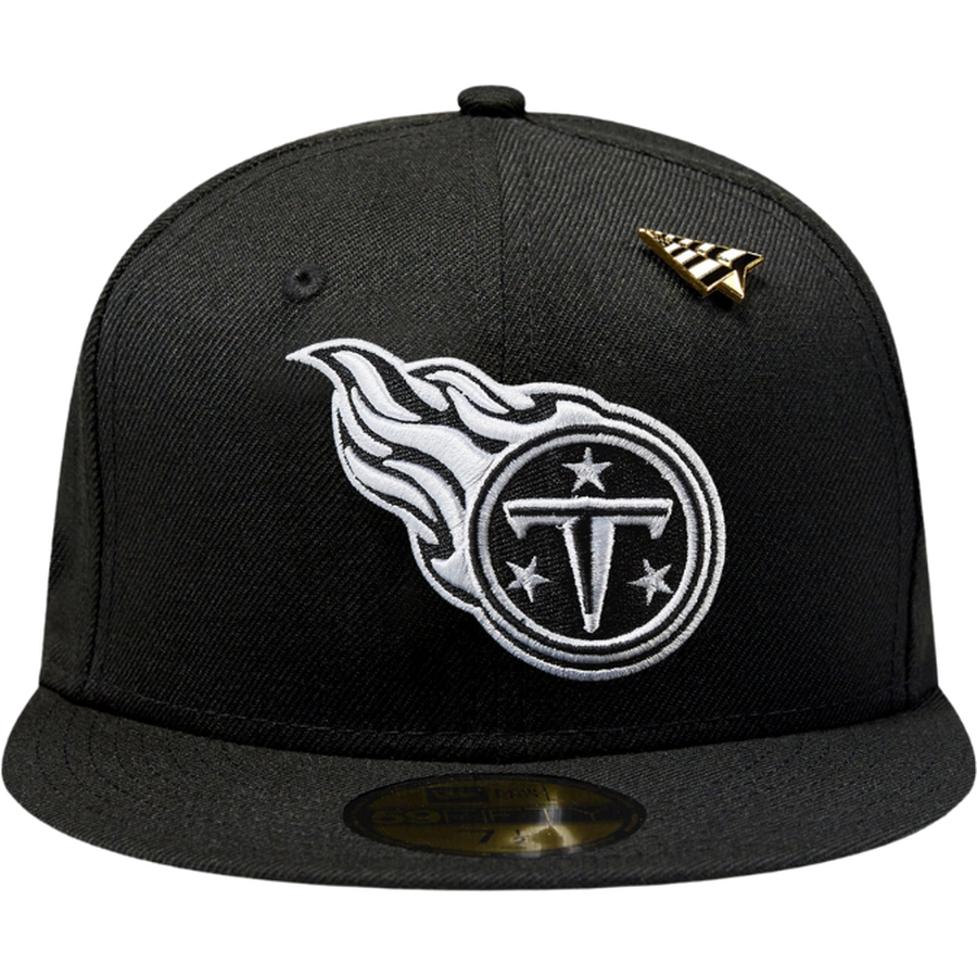 This New Era Paper Planes x Tennessee Titans 59FIFTY Fitted Hat is a collaboration between Paper Planes x New Era & the NFL. The fitted has a black six panel structured high crown, embroidered eyelets and fabric squatchee button. The flat bill of the fitted cap is also black with a green undervisor and white sweatband. The front panel features the NFL team logo embroidery. The left panel of the fitted displays the New Era logo and the Paper Planes logo on the right panel. The NFL shield is embroidered on the rear crown.