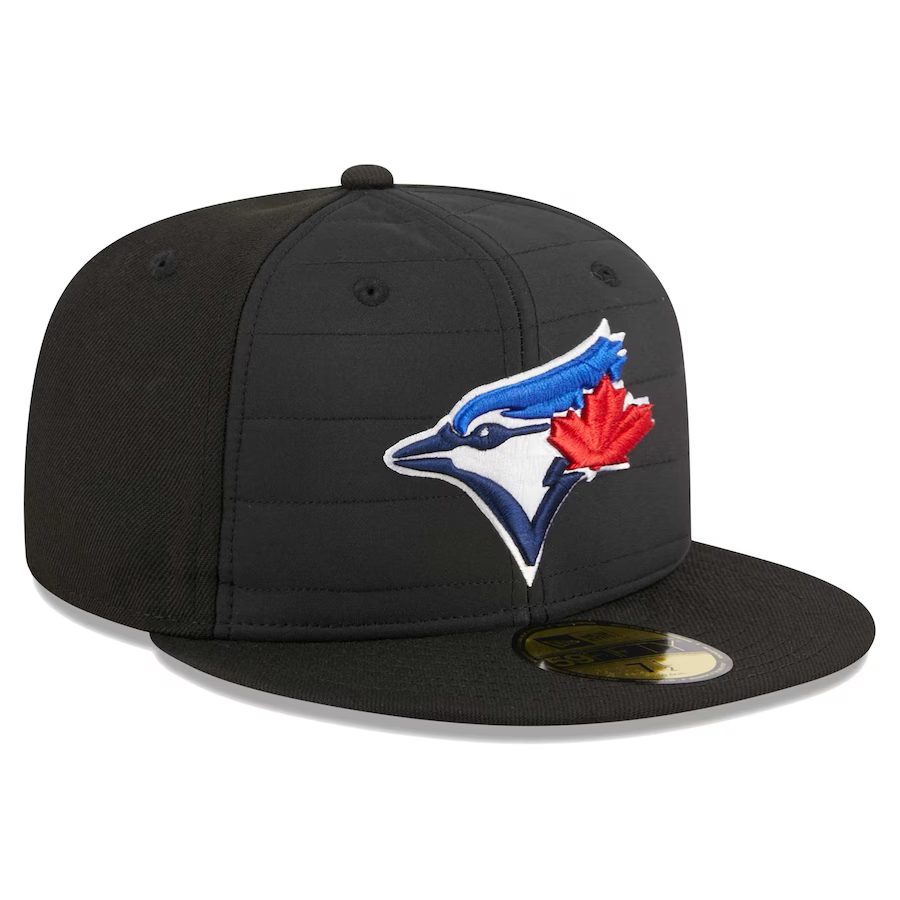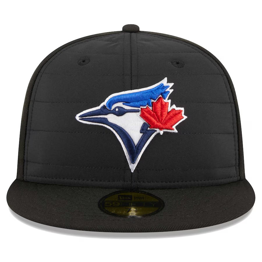The New Era Black Quilt 59FIFTY hat is a fantastic accessory to show off on game day. It showcases classic Toronto Blue Jays embroidery on quilted fabric, giving it an authentic and timeless appearance. With its fitted and structured construction, it boasts a modern design that is sure to impress.