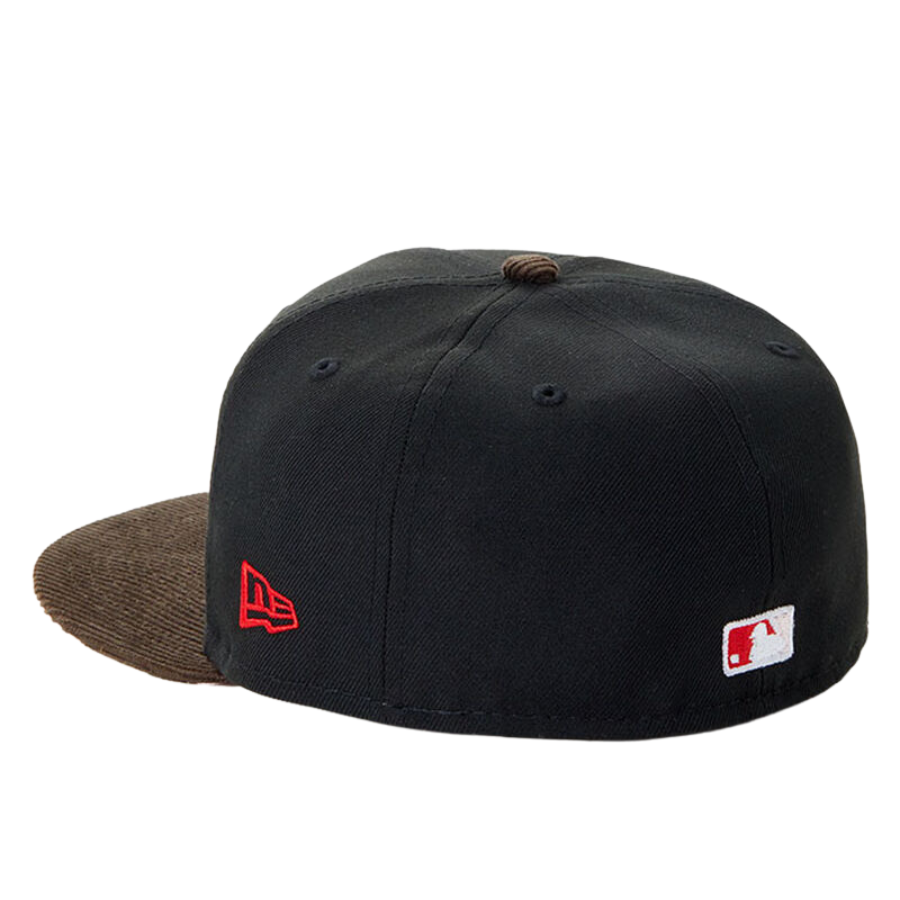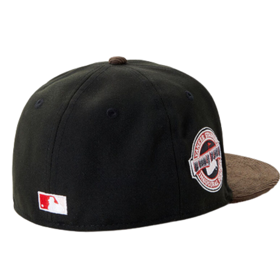 This New York Yankees fitted hat was released by PacSun. The fitted has a black six panel structured high crown and embroidered eyelets with a walnut brown corduroy fabric squatchee button. The fitted cap also has a walnut brown corduroy flat bill with a soft pink undervisor and white sweatband. The front panel features the New York Yankees logo embroidery and an Inaugural Season side patch on the right panel. The left panel of the fitted displays the New Era logo and the official MLB Batterman logo embroidery on the rear crown.
