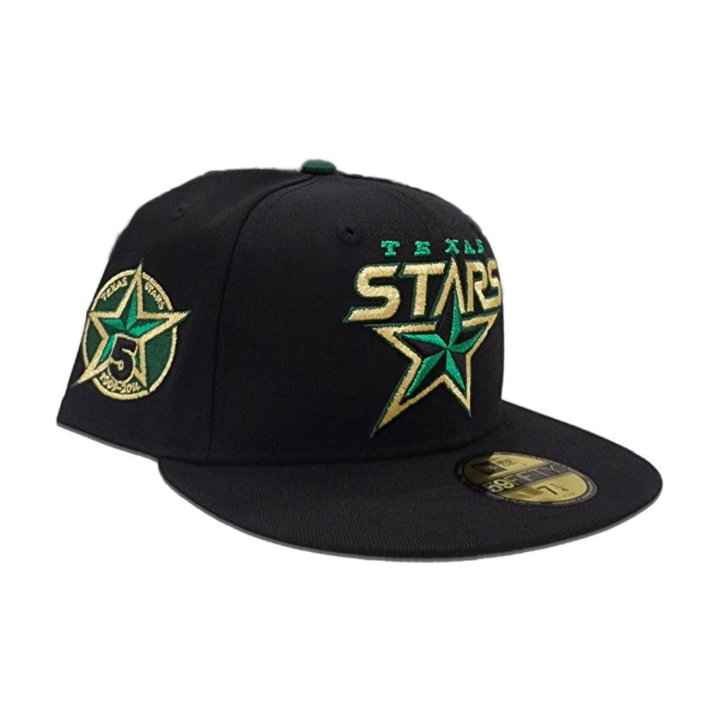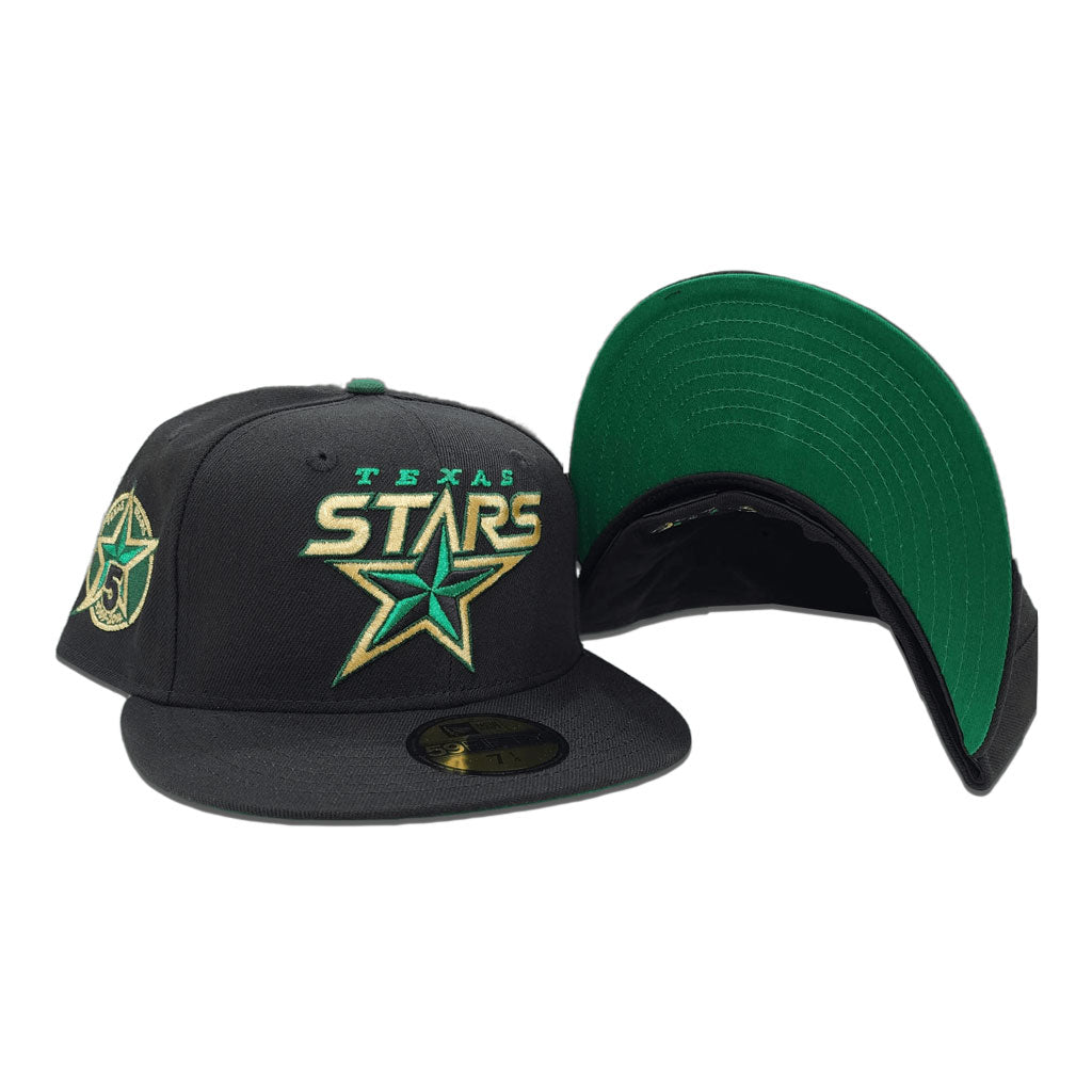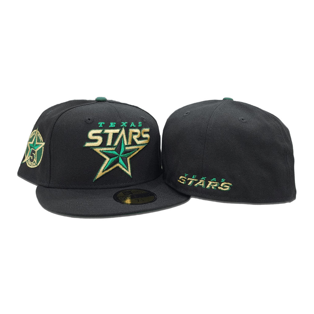This Dallas Texas Stars fitted hat was released by Exclusive Fitted. The fitted has a black six panel structured high crown and embroidered eyelets with a green fabric squatchee button. The flat bill of the cap is black with a green undervisor and black sweatband. The front panel features the Dallas Texas Stars logo embroidery and a 5th Anniversary side patch embroidery on the right panel.