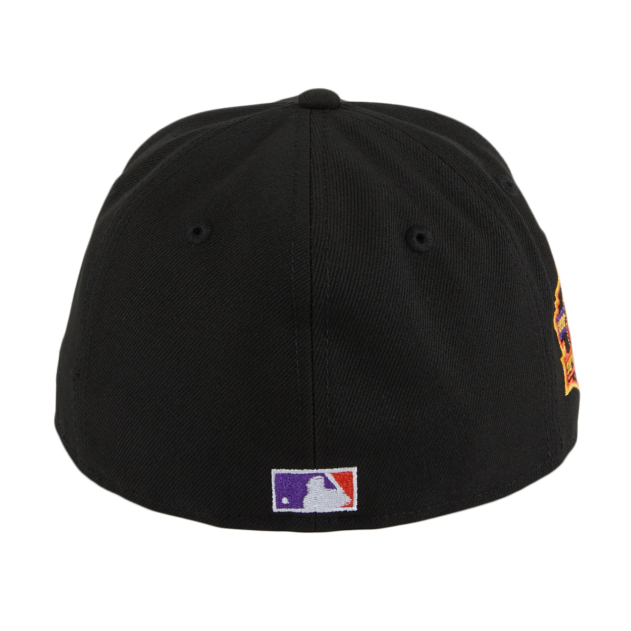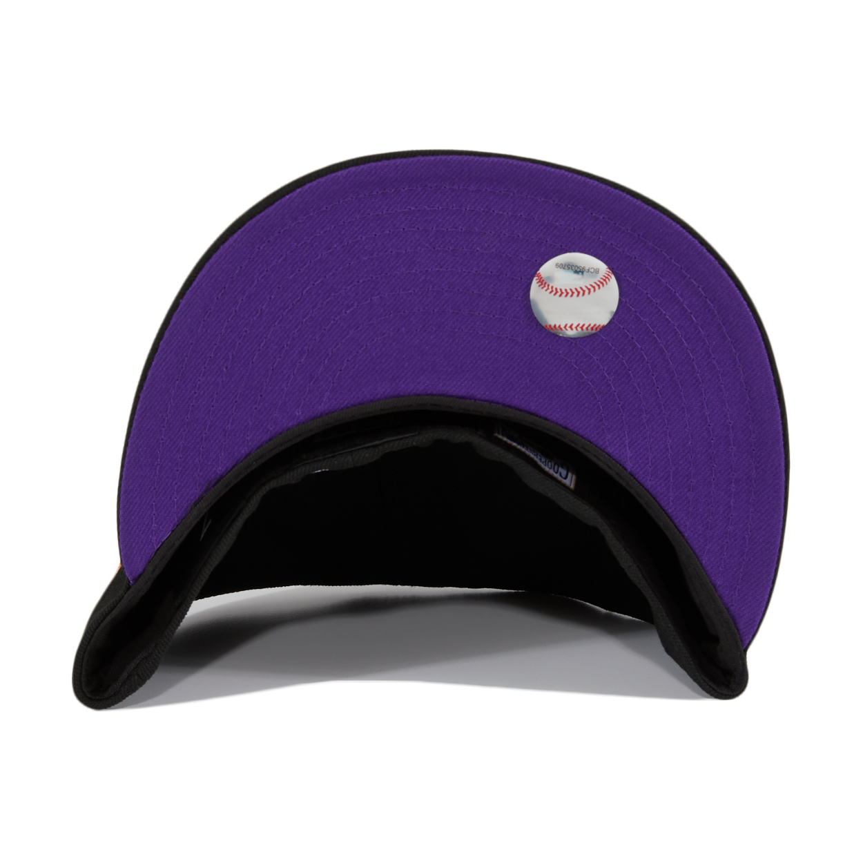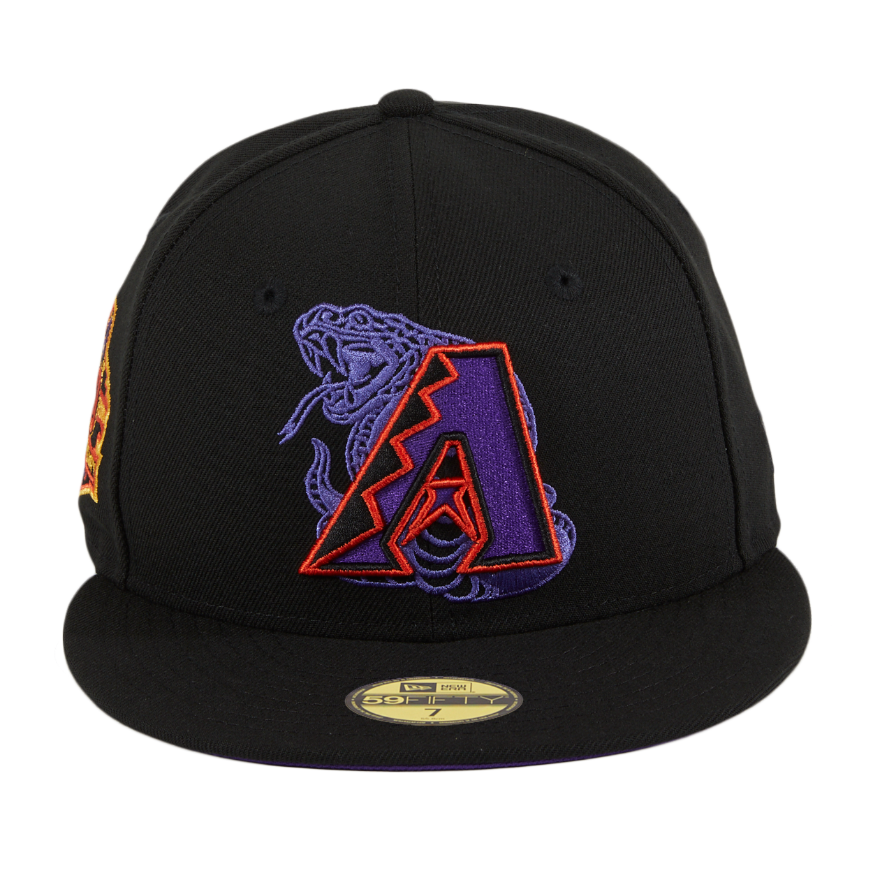 The New Era Arizona Diamondbacks 59FIFTY Fitted Hat is a Hat Club exclusive. The six panel high crown, embroidered eyelets and fabric squatchee button and flat bill is black with a purple undervisor. The front panel features the Diamondbacks logo with a purple snake embroidery. The right panel features a 20th Anniversary side patch.