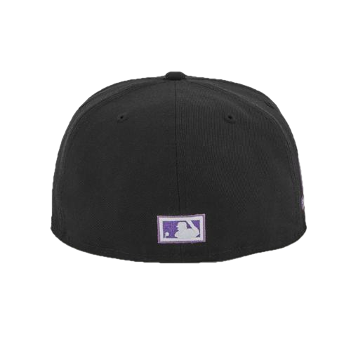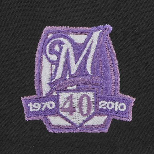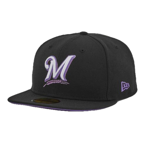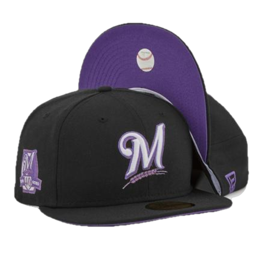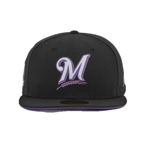 This New Era Milwaukee Brewers Mileena "Flawless Victory" 59FIFTY fitted hat has a black six panel construction, fabric squatchee button and flat bill. The under brim of the fitted is purple with a white sweatband. The front panel features the Brewers logo embroidery with an Anniversary side patch on the right-wear side.