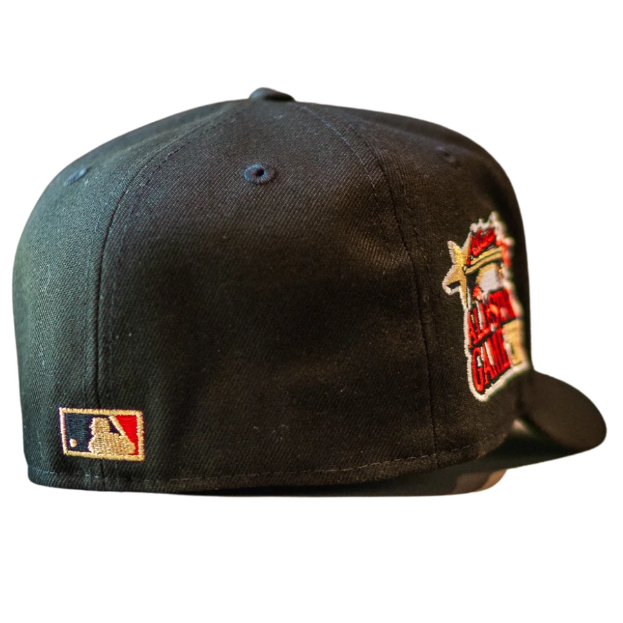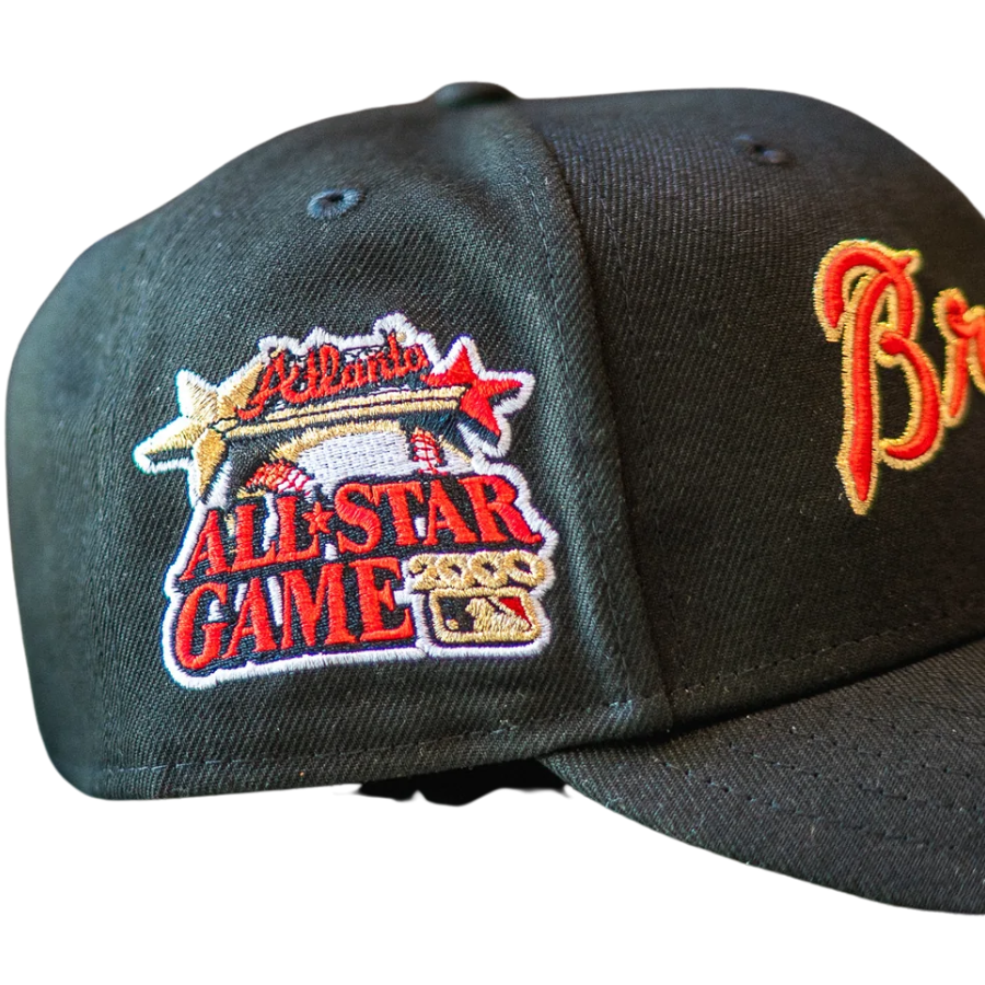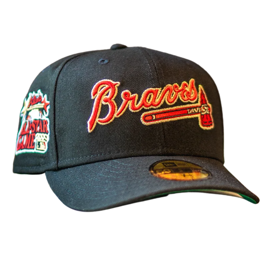 This New Era Atlanta Braves 59FIFTY fitted hat was released by Sneaker Town. The fitted has a black six panel structured high crown, embroidered eyelets, fabric squatchee button and flat bill with a green bottom under bill. The front panel features the Atlanta Braves script logo embroidered in red stitching outlined in gold threads with a 2000 All-Star Game side patch on the right-wear side in the same colorway.