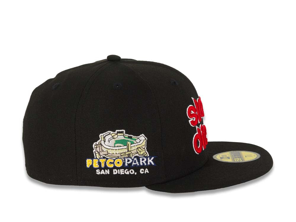 This 59FIFTY San Diego Padres fitted hat was released by Capland. The fitted has a black six panel structured high crown, embroidered eyelets, fabric squatchee button and flat bill. The cap also has a green undervisor. The front panel features a red script "Slam Diego" San Diego Padres embroidery with a Petco Park side patch on the right-wear side.
