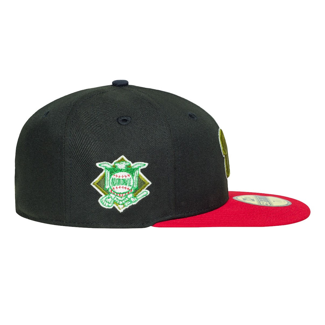 This Washington Nationals 59FIFTY fitted hat was released by Leaders 1354. The fitted has a black six panel structured high crown and embroidered eyelets with a black fabric squatchee button. The fitted cap also has a red flat bill with a kelly green undervisor and white sweatband. The front panel features the Washington Nationals logo embroidery and a National League side patch embroidery on the right panel. The left panel of the fitted displays the New Era logo and the official MLB Batterman logo embroidery on the rear crown.