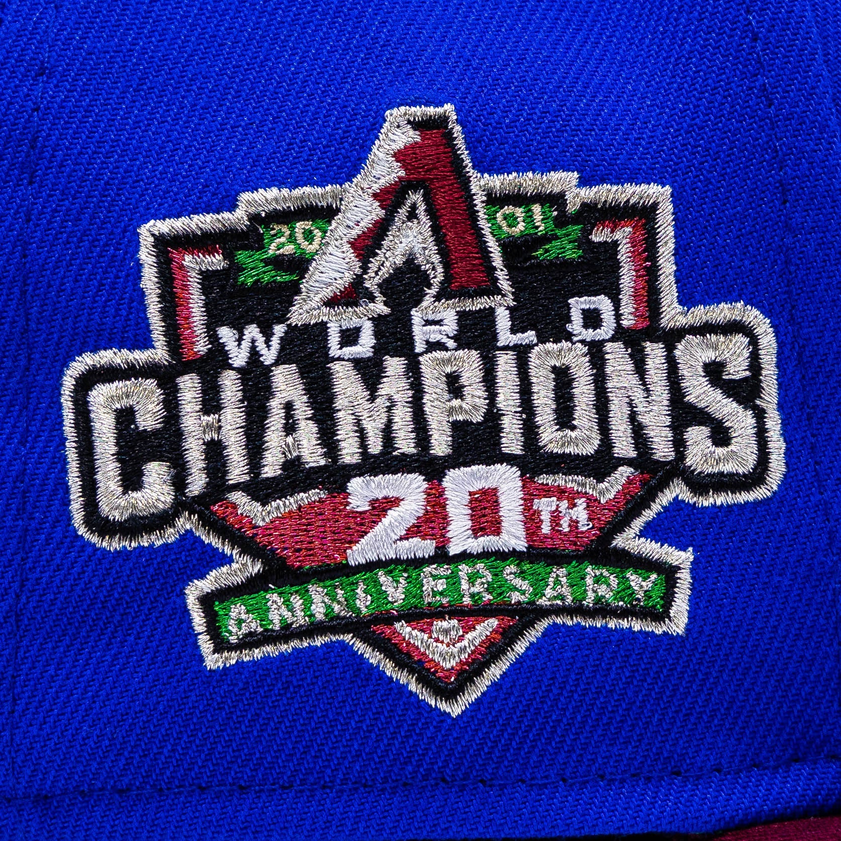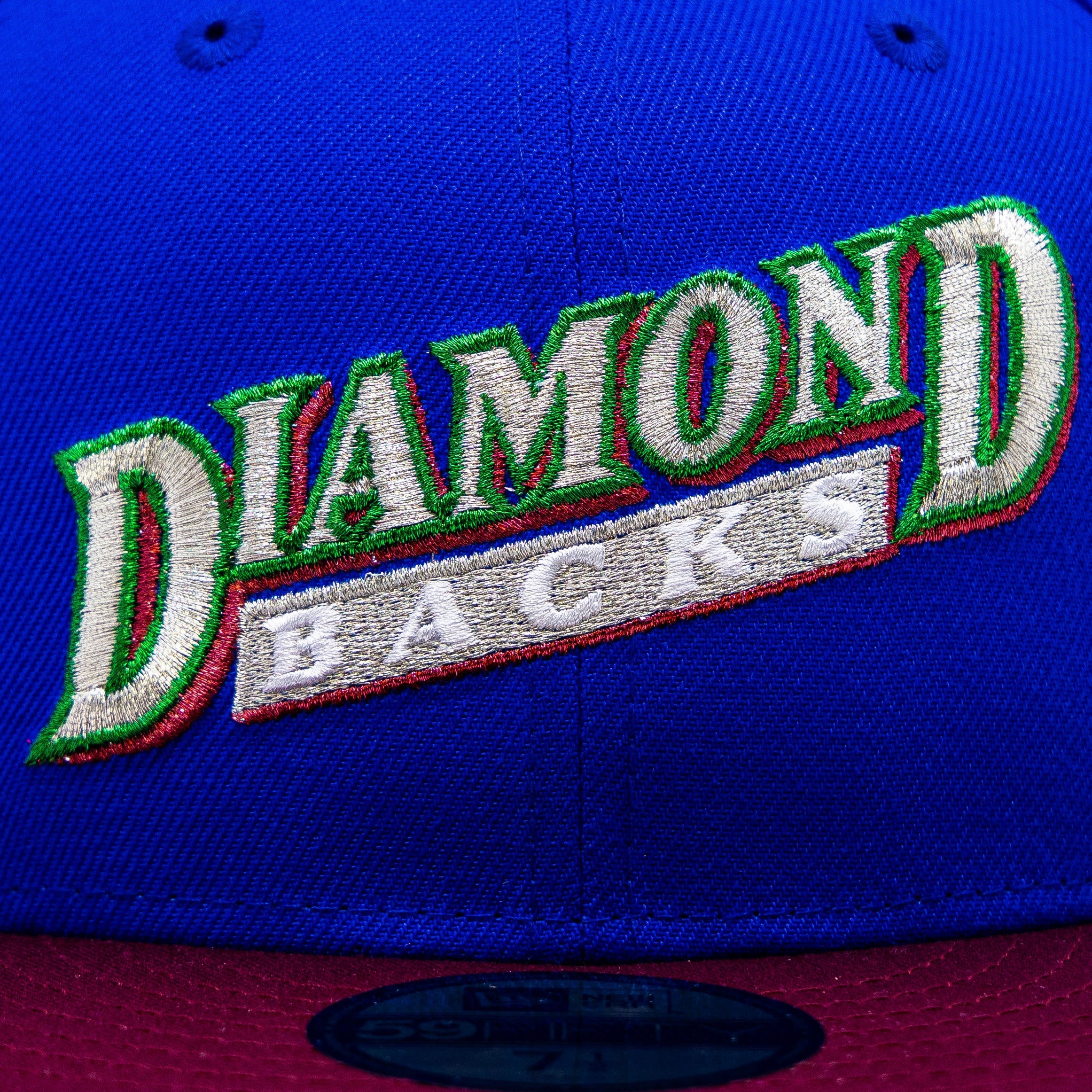 This Arizona Diamondbacks fitted hat was released by All The Right. The fitted has a burger six panel structured high crown and embroidered eyelets with a burgundy fabric squatchee button. The flat bill of the cap is also burgundy with a green undervisor and black sweatband. The front panel features the Arizona Diamondbacks logo embroidery and a 20th Anniversary World Champions side patch embroidery on the right panel.