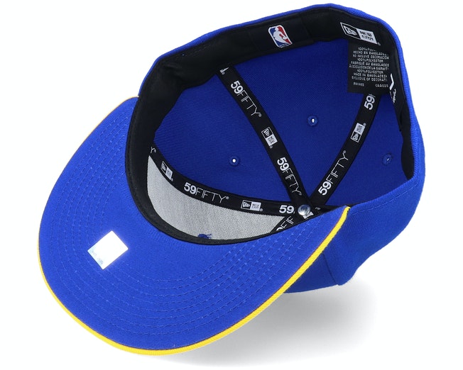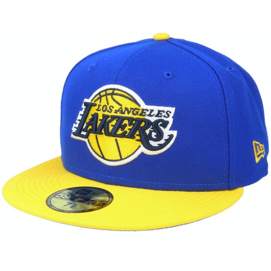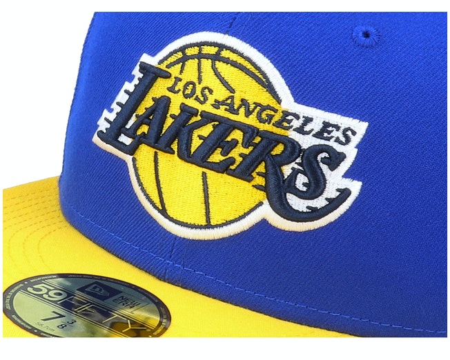 This New Era Los Angeles Lakers 59FIFTY fitted hat has a royal blue and yellow colorway. The six panel structured high crown, and embroidered eyelets are royal blue with a yellow fabric squatchee button and flat bill. The undervisor of the fitted is also royal blue with a black sweatband. The front panel features the Los Angeles Lakers logo embroidery.