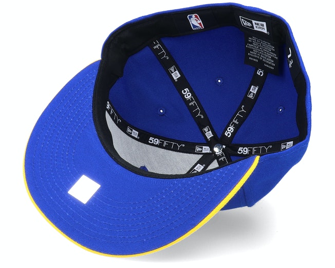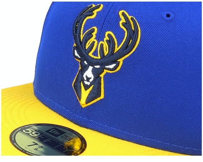This New Era Milwaukee Bucks 59FIFTY fitted hat has a royal blue and yellow colorway. The six panel structured high crown, and embroidered eyelets are royal blue with a yellow fabric squatchee button and flat bill. The undervisor of the fitted is also royal blue with a black sweatband. The front panel features the Milwaukee Bucks logo embroidery.