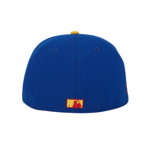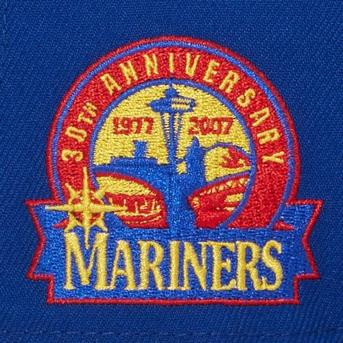 This New Era Seattle Mariners Royal Blue/Red/Yellow "Superman" 59FIFTY Fitted Hat has a royal blue six panel structured high crown and embroidered eyelets with a royal blue fabric squatchee button. The fitted cap has a royal blue flat bill with a red undervisor and white sweatband. The front panel features the Seattle Mariners logo embroidery and a 30th Anniversary side patch on the right panel. The left panel of the fitted displays the New Era logo and the official MLB logo embroidery on the rear crown.