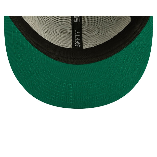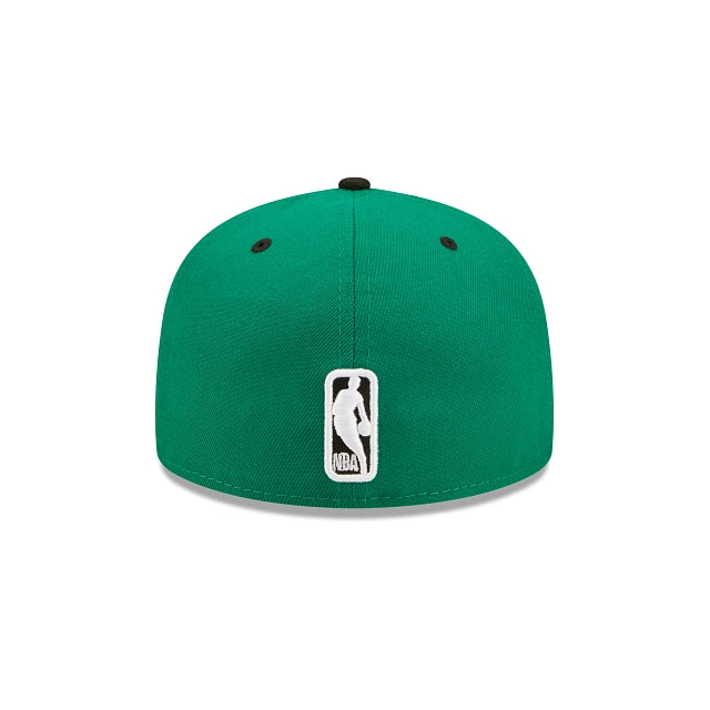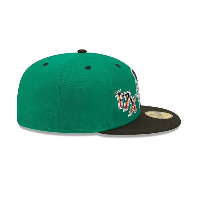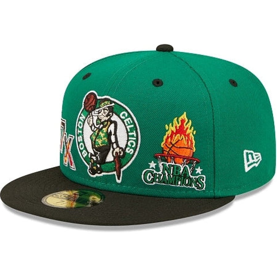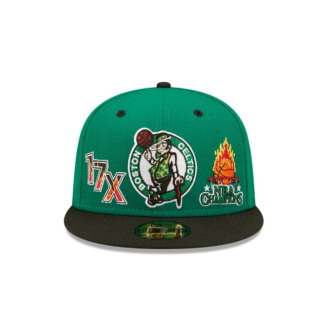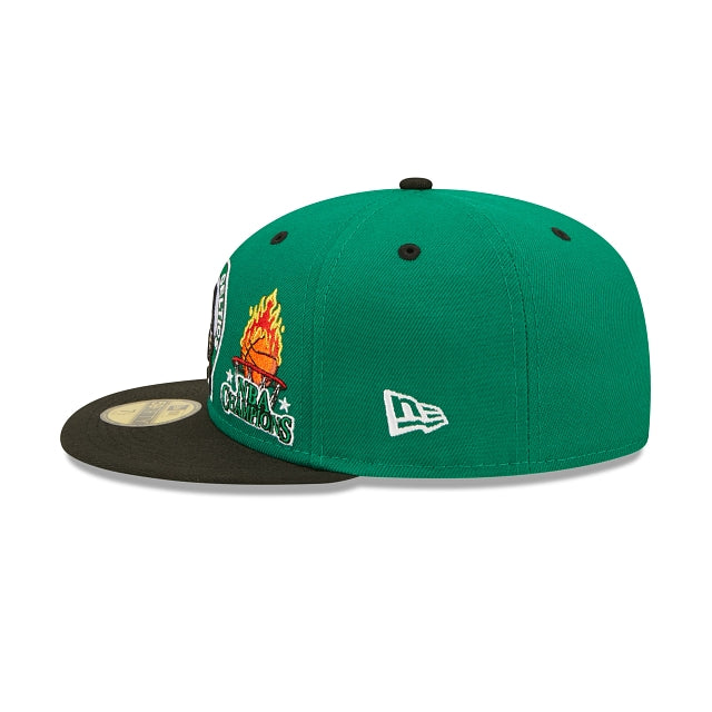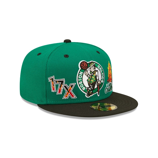 The Boston Celtics Fire 59FIFTY Fitted Cap features an embroidered Celtics logo at the front panels between NBA Championship themed patches, and an NBA logo at the rear. Additional details include a green undervisor.
