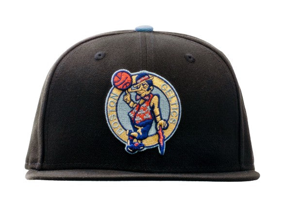 This New Era Boston Celtics NBA Summer Edition 59FIFTY fitted hat is a Shoe Palace exclusive. It has a black six panel structured high crown, and embroidered eyelets with a light blue fabric squatchee button. The fitted cap also has a black flat bill with a light blue undervisor and black sweatband. The front panel features the Boston Celtics logo embroidery. The left panel of the fitted displays the New Era logo and the official NBA logo embroidery on the rear crown.