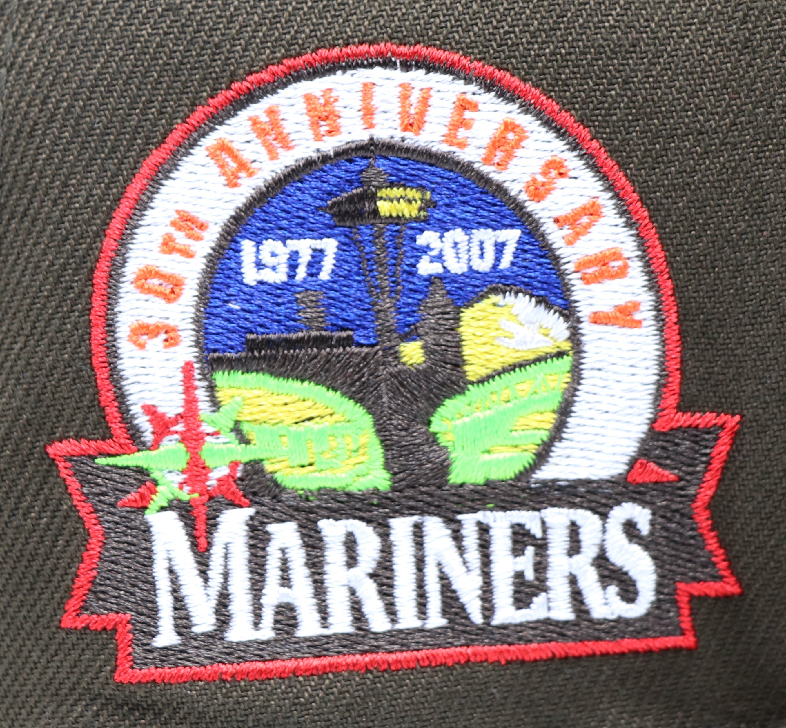 This New Era Seattle Mariners "M&M" Brown/Lime Green 30th Anniversary 59FIFTY Fitted Hat is a 4ucaps exclusive. The fitted has a dark brown six panel structured high crown and embroidered eyelets with a dark brown fabric squatchee button. The fitted cap also has a dark brown flat bill with a lime green undervisor. The front panel features the Seattle Mariners throwback logo embroidery in lime green and a 30th Anniversary side patch embroidery on the right panel. The left panel of the fitted displays the New Era logo and the official MLB logo embroidery on the rear crown.