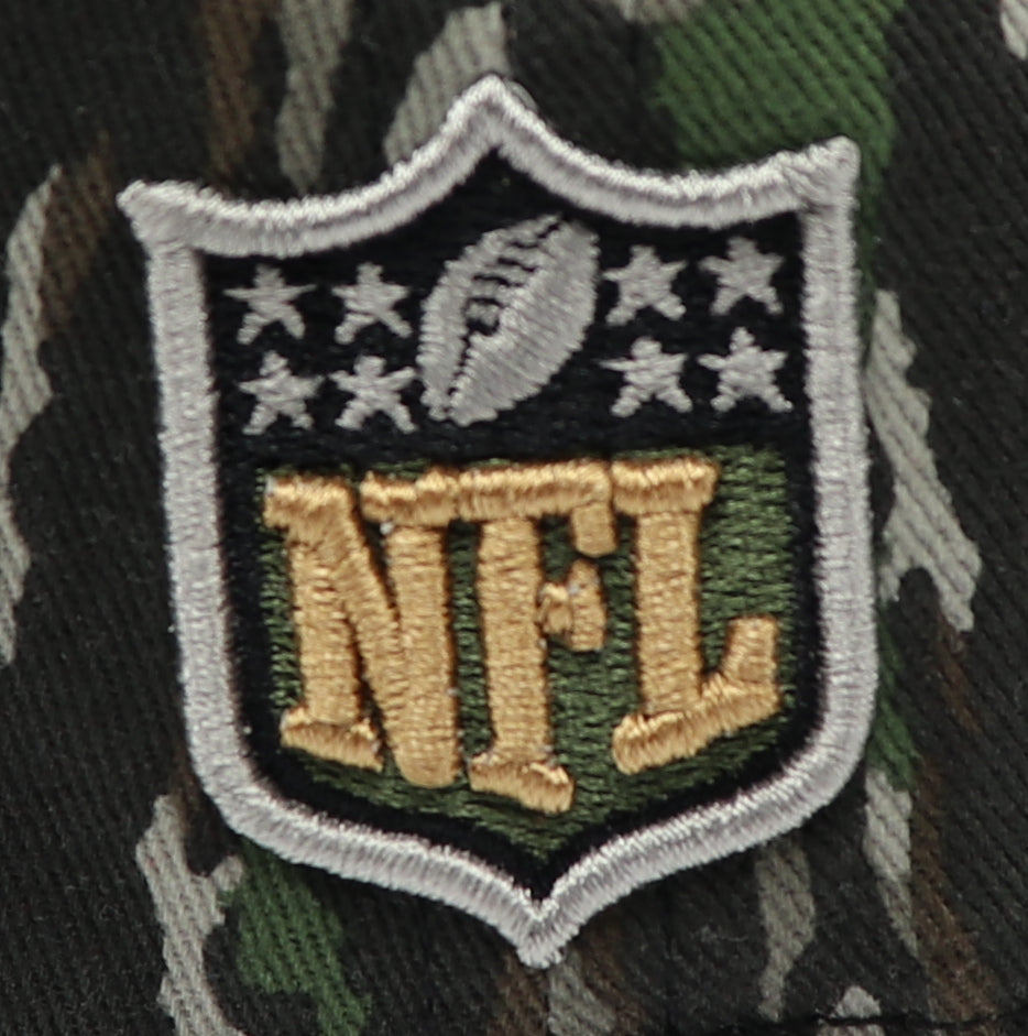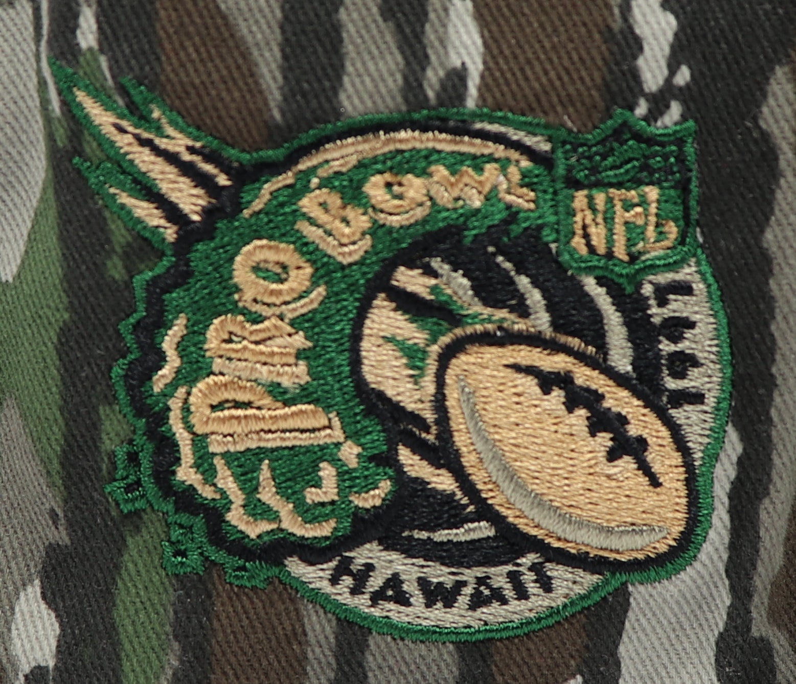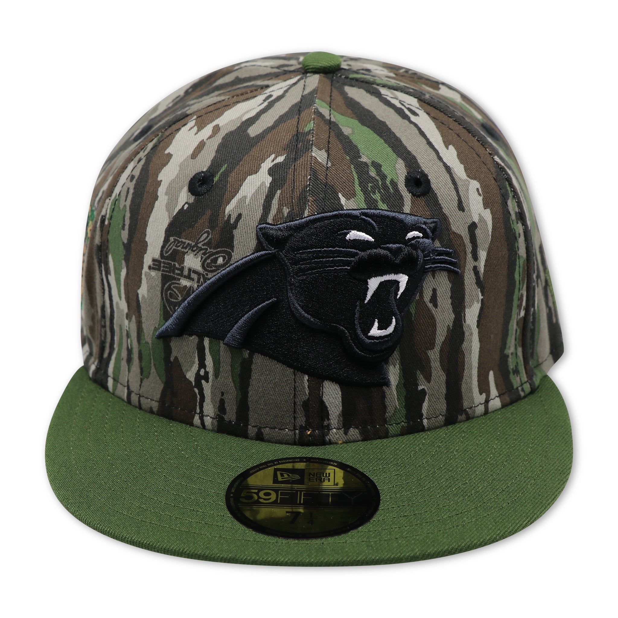 This New Era Carolina Panthers Camo/Rifle Green 1997 Pro Bowl 59FIFTY Fitted Hat has a camouflage six panel structured high crown and black embroidered eyelets with a rifle green fabric squatchee button. The fitted cap has a rifle green flat bill with a light brown undervisor. The front panel features the Carolina Panthers logo embroidery and a Pro Bowl side patch embroidery on the right panel. The left panel of the fitted displays the New Era logo and the official NFL logo embroidery on the rear crown.