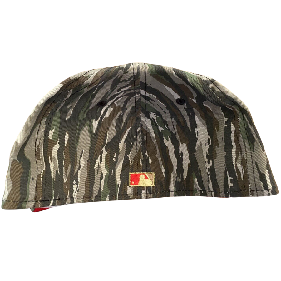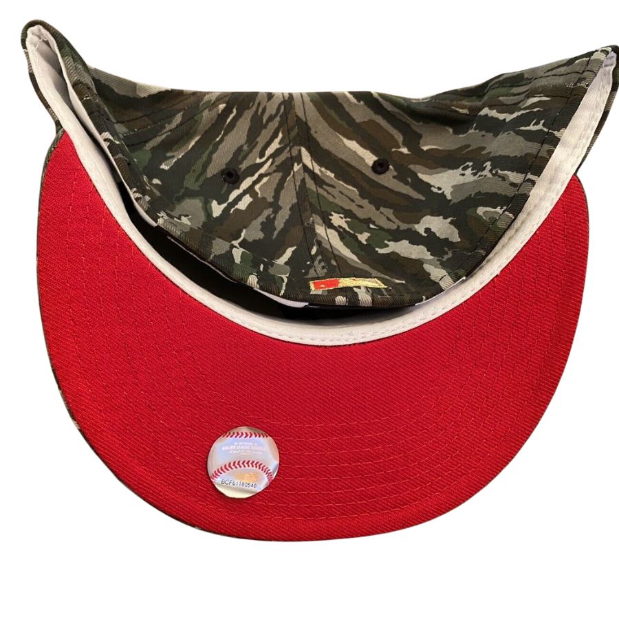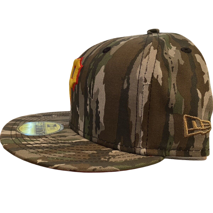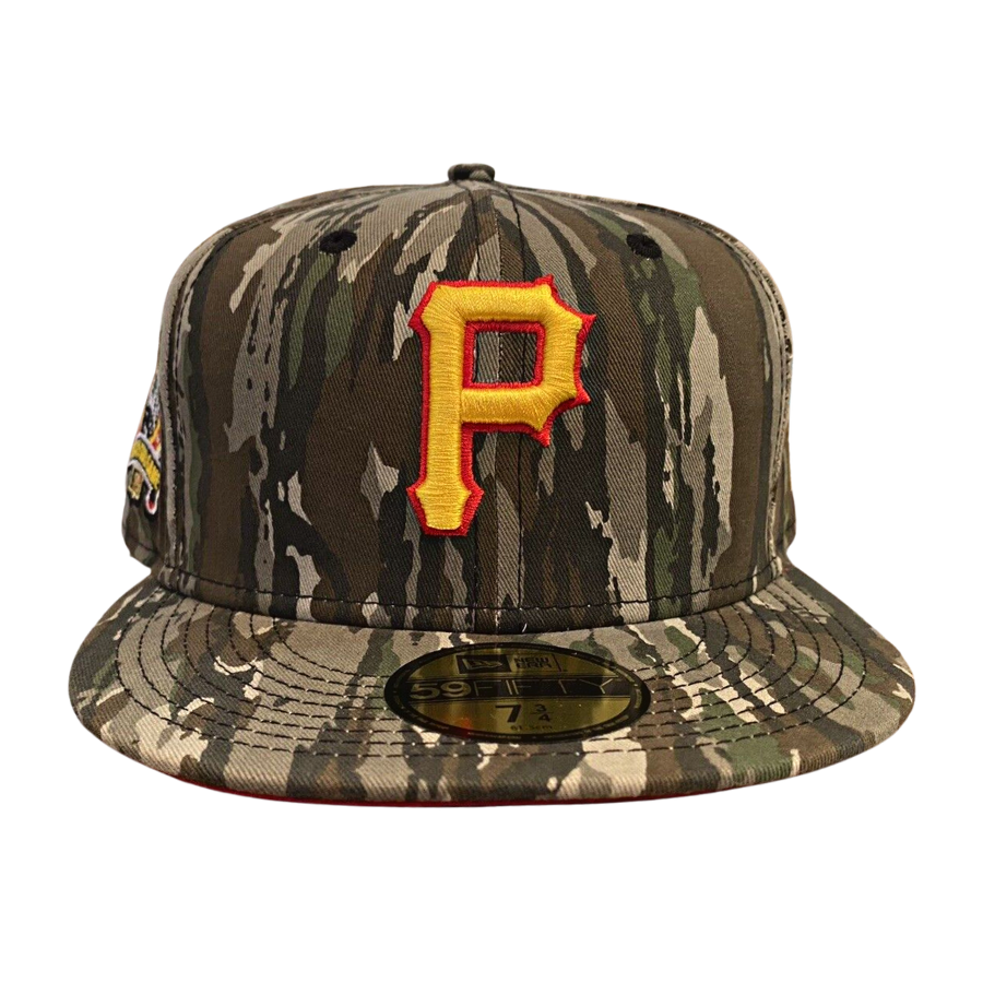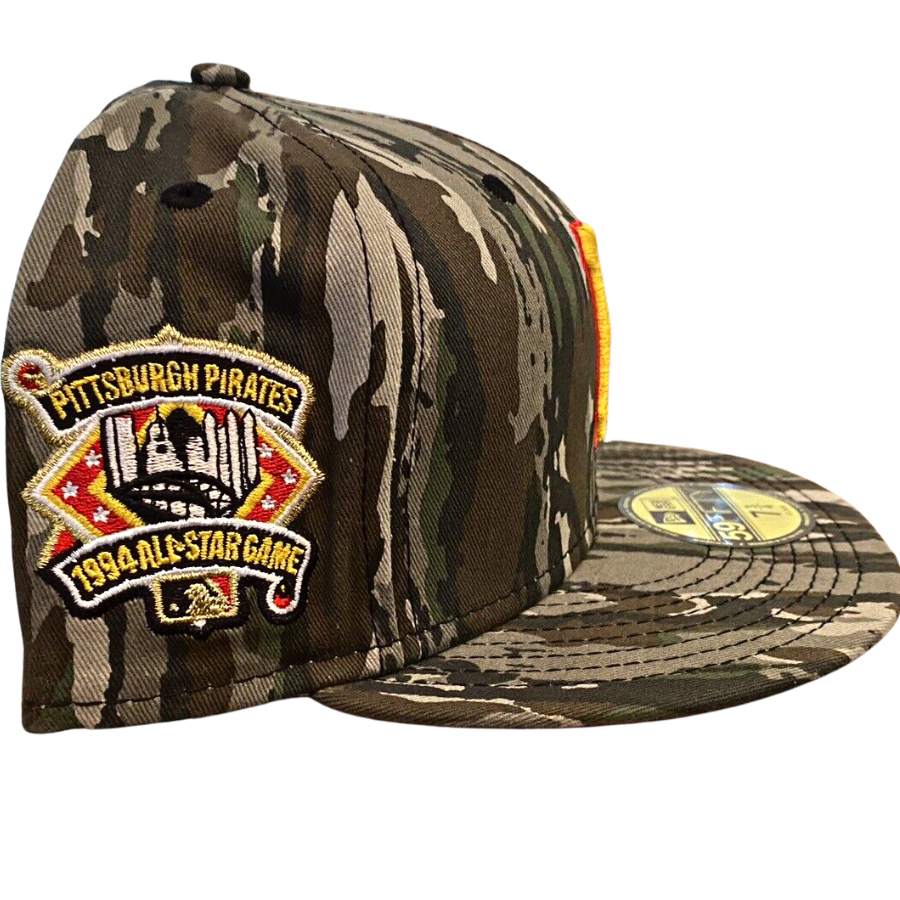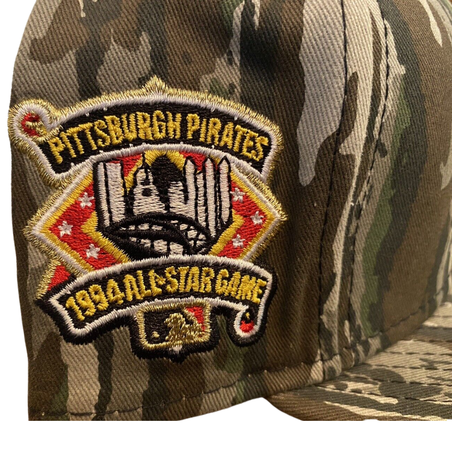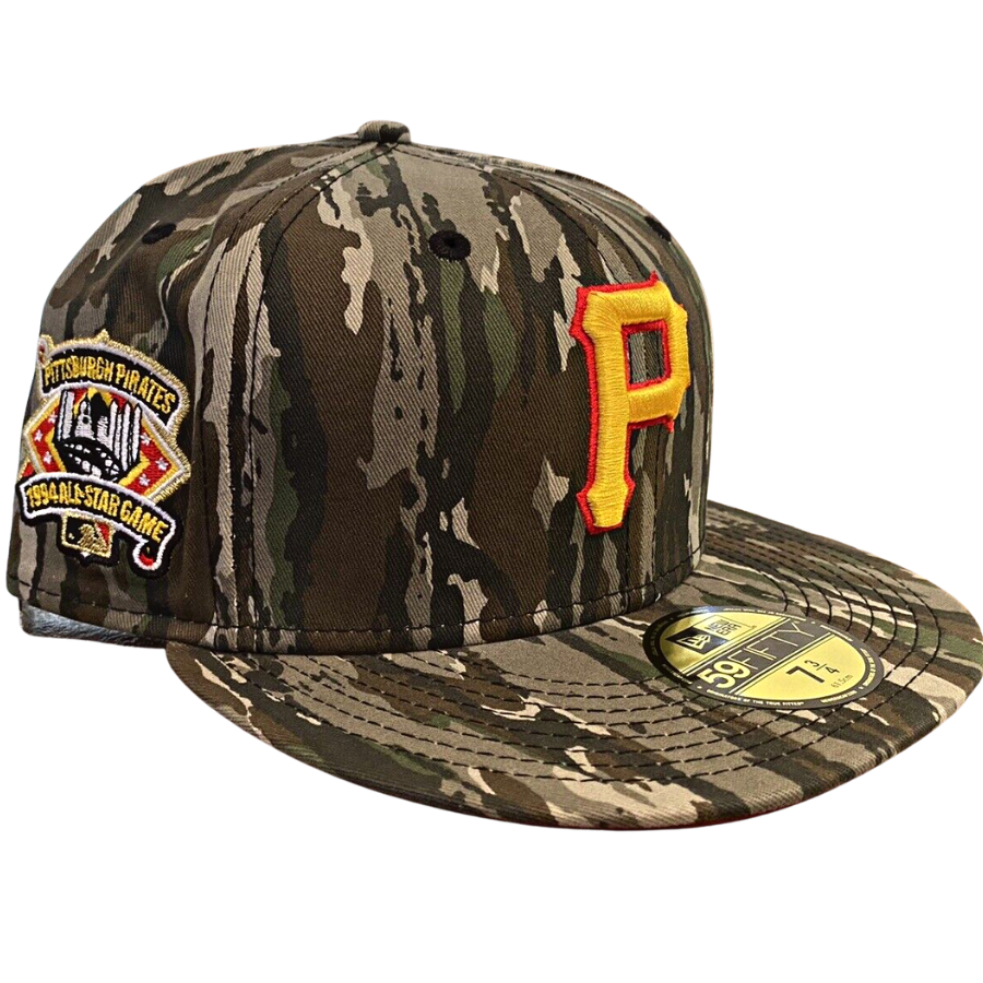 This New Era Pittsburgh Pirates Camo 1994 All-Star Game Red UV 59FIFTY Fitted Hat has a camouflage six panel structured high crown, and fabric squatchee button with black embroidered eyelets. The flat bill of the fitted cap is also camouflage with a red undervisor and white sweatband. The front panel features the Pittsburgh Pirates logo embroidery with a 1994 ASG side patch embroidered on the right panel.