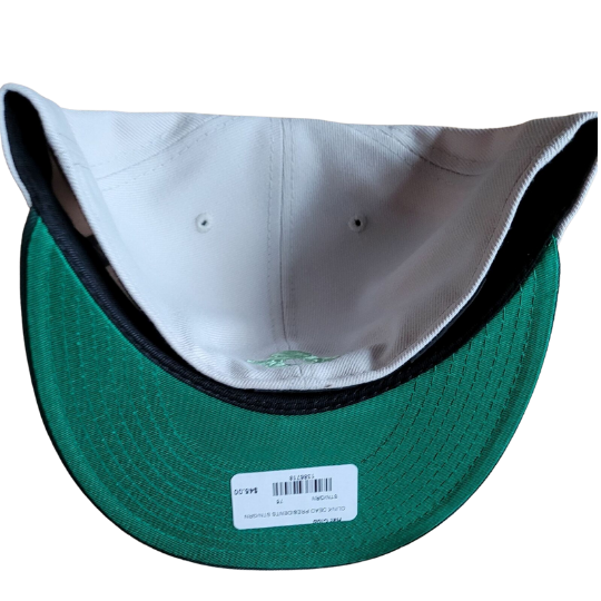 "Im out for dead presidents to represent me" was the line from a Jay Z song Dead Presidents (considered one of his best songs ever). However, this Dead President fitted hat is an exclusive design from The Clink Room. The concept of the hat and song by Jay Z only have the name in common, it has no relation to Jay Z. The fitted features a white structured six panel high crown and embroidered eyelets. The fabric squatchee button and flat bill of the fitted is forest green with a kelly green undervisor. The front panel features a skull face George Washington-like image in the same design as the portrait on a one dollar bill. The artwork is embroidered in shades of green, white and black.