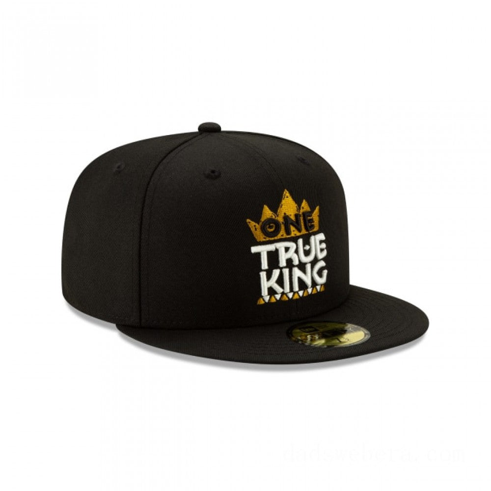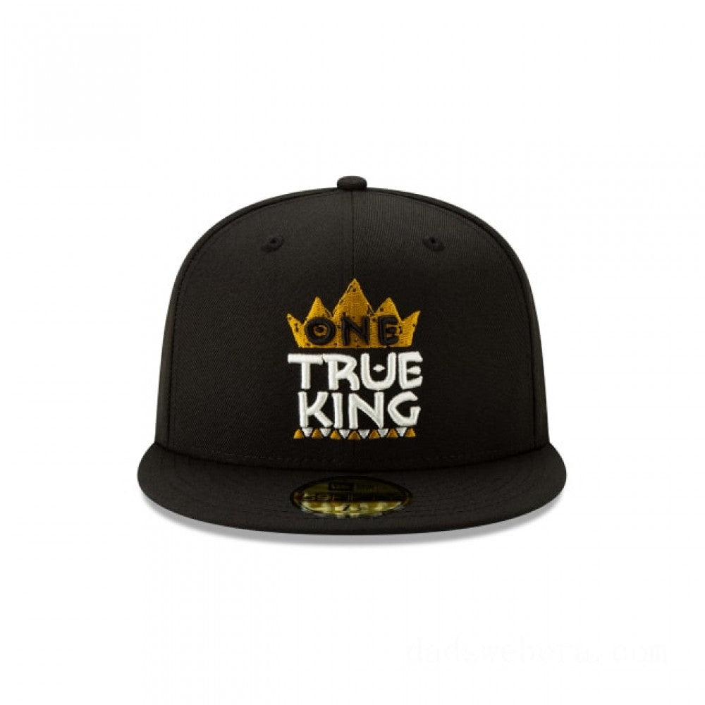The Lion King One True King 59FIFTY Fitted Cap features a One True King insignia embroidered in white, black and gold at the front panels with a silhouette of Simba embroidered at the rear. Additional details include a colored undervisor and a safari-inspired interior lining. The six panel structured high crown, embroidered eyelets, fabric squatchee button and flat bill of the fitted are black.