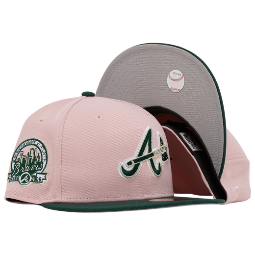 This New Era Atlanta Braves 59FIFTY fitted hat is a Champs Sports exclusive release. The fitted has a blush pink six panel structured high crown and embroidered eyelets with a dark green fabric squatchee button and flat visor. The fitted also has a grey bottom undervisor. The front panel features the Atlanta Braves logo embroidered in dark green stitching with a 40th Anniversary side patch on the right panel.