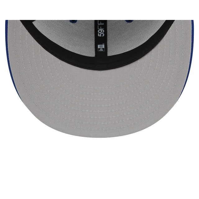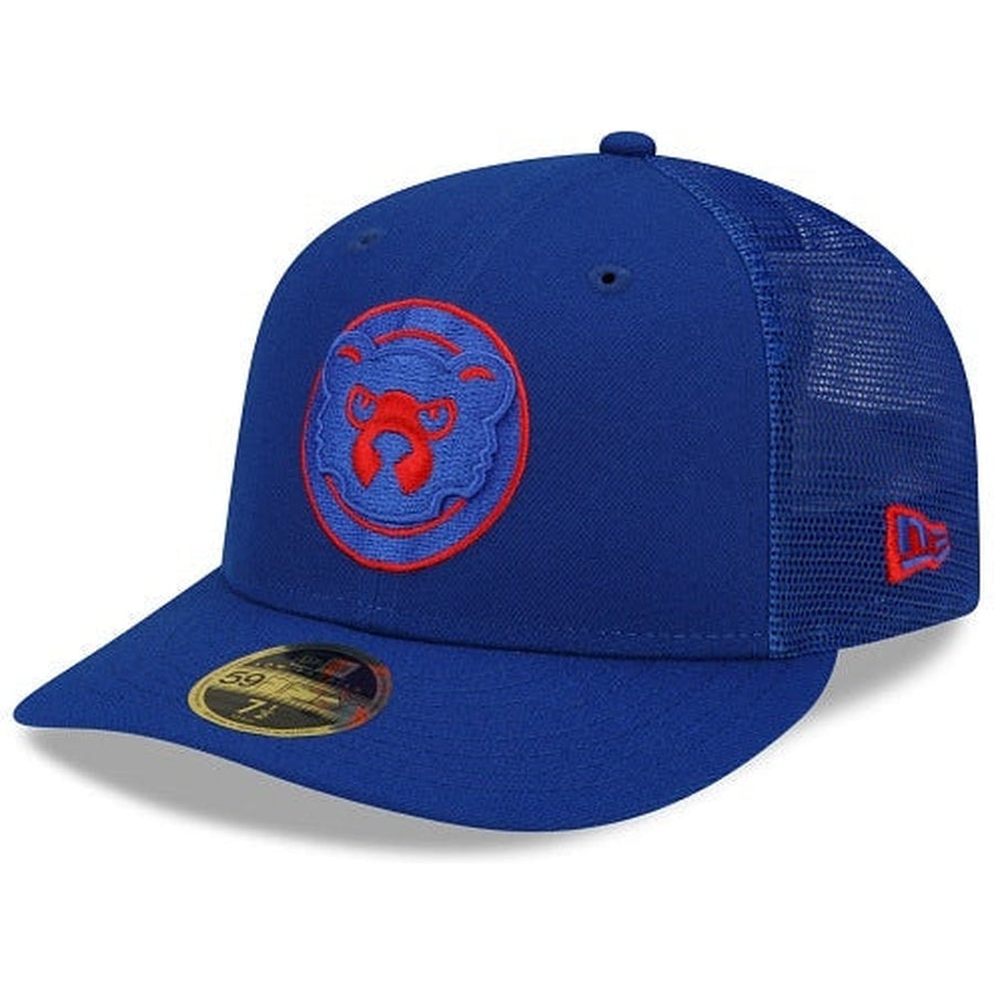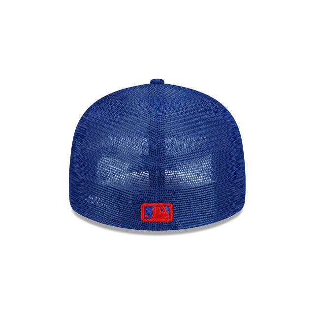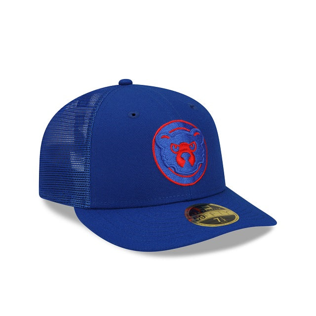 The Chicago Cubs 2023 Batting Practice Low Profile 59FIFTY Fitted Cap features an embroidered Cubs logo at the front panels with a matching MLB Batterman logo at the rear and a gray undervisor.