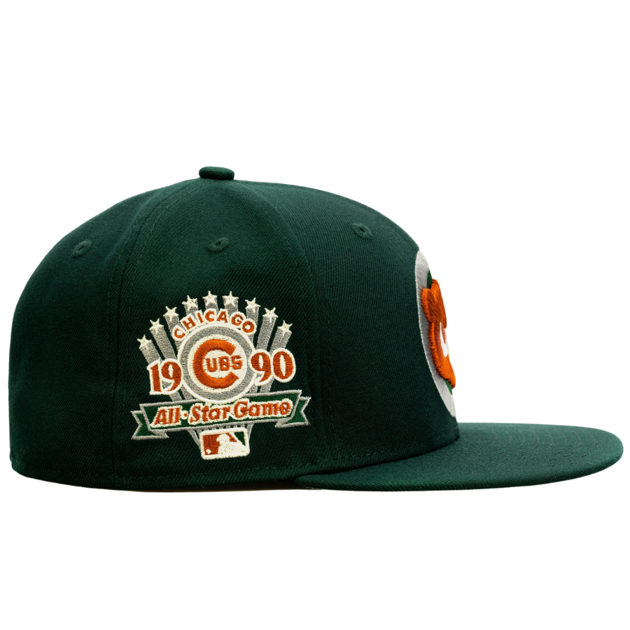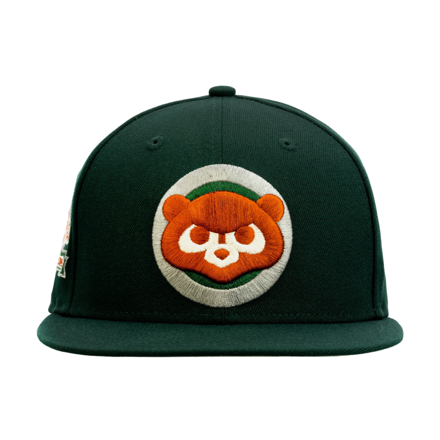 This New Era x Shoe Palace St. Patty's Day Chicago Cubs 2023 59FIFTY Fitted Hat was released by Shoe Palace. The fitted has a dark green six panel structured high crown and embroidered eyelets with a dark green fabric squatchee button. The fitted cap also has a dark green flat bill with a grey undervisor and black sweatband. The front panel features the Chicago Cubs logo embroidery and a celebratory side patch embroidery on the right panel. The left panel of the fitted displays the New Era logo and the official MLB Batterman logo embroidery on the rear crown.