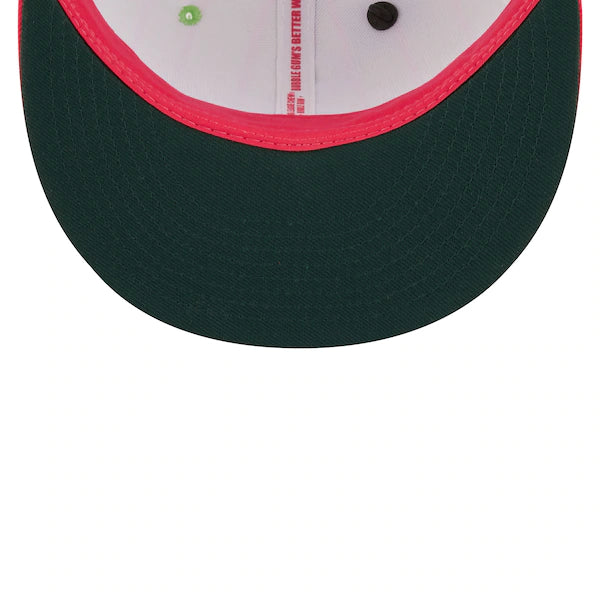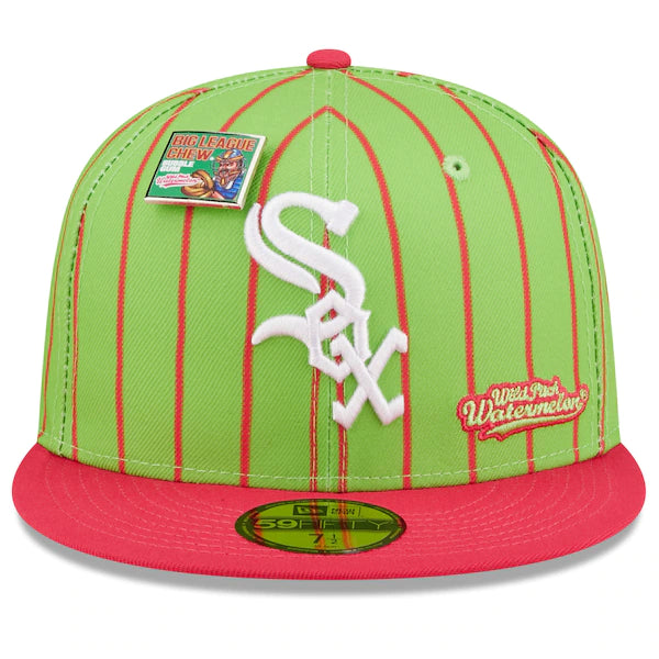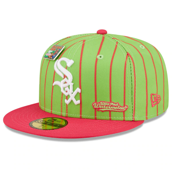 The MLB and Big League Chew have teamed up to bring Chicago White Sox fans this one of a kind, Wild Pitch Watermelon Flavor Pack 59FIFTY Fitted Hat. Featuring a high crown and flat bill, this New Era hat will take your game day look to the next level. Its classic and fun graphics combine your Chicago White Sox and your all-time favorite Big League Chew flavor, making it unlike anything else in your collection.